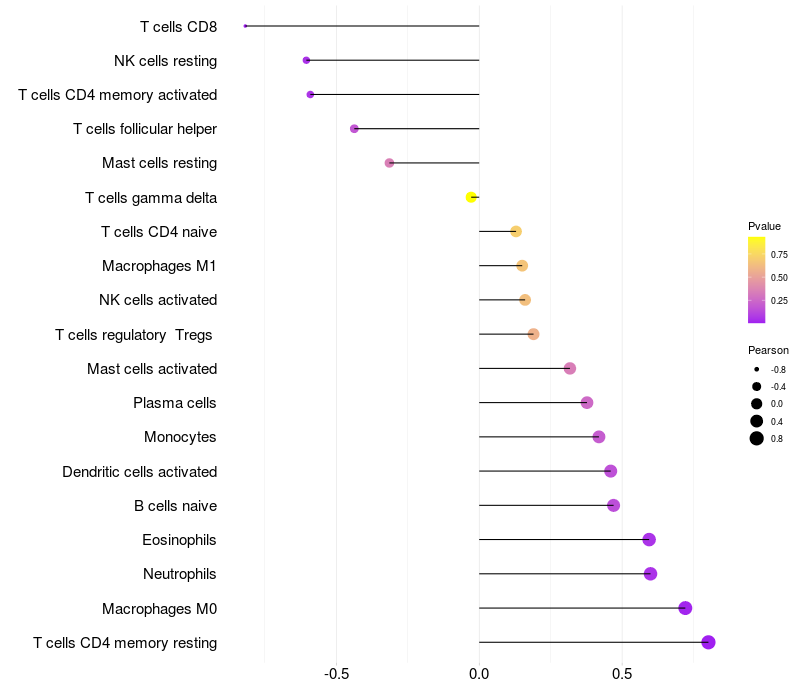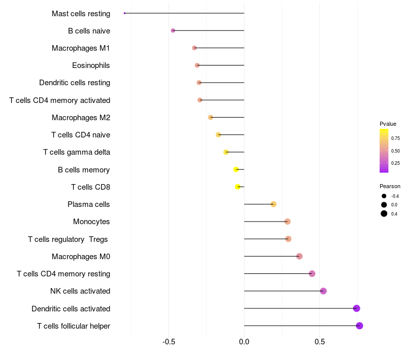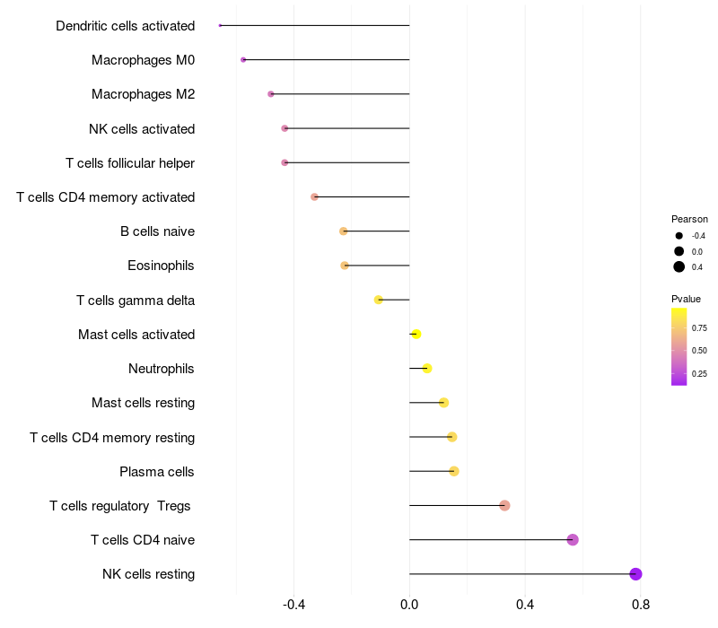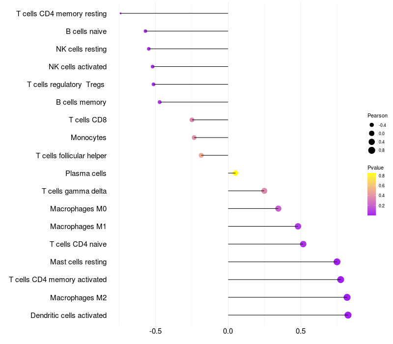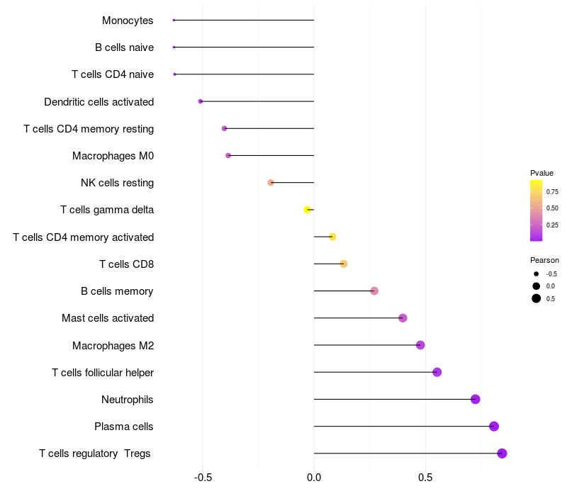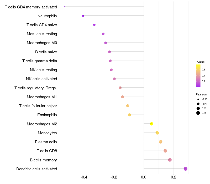 Lollipop of LTBP1 expression and immune infiltrating cell level correlation result in EBV+ samples