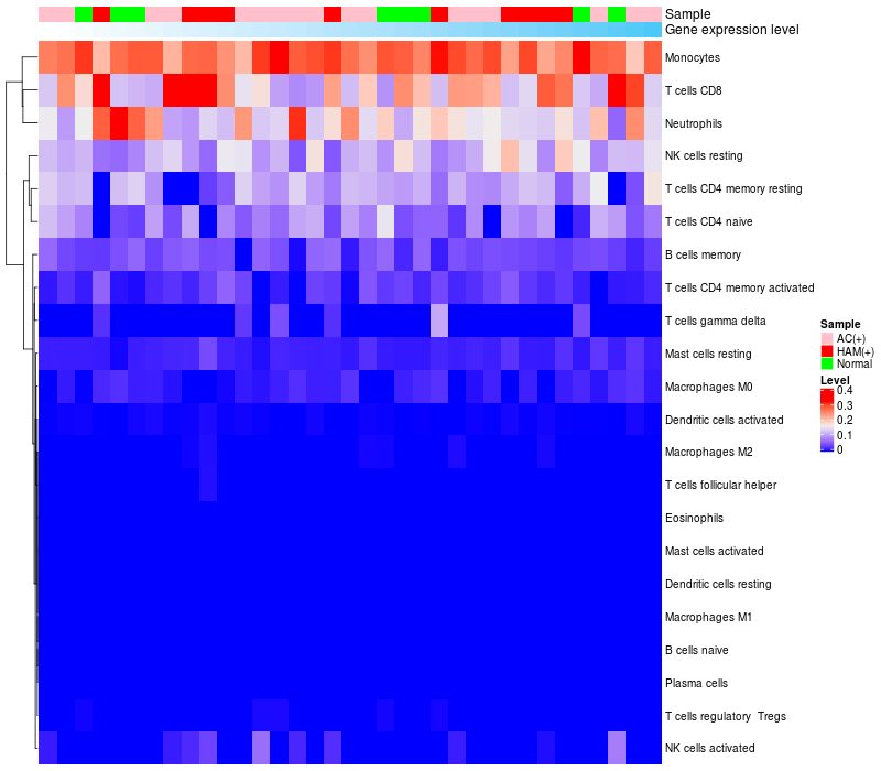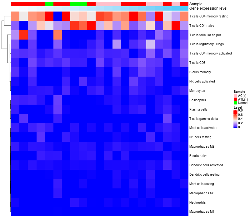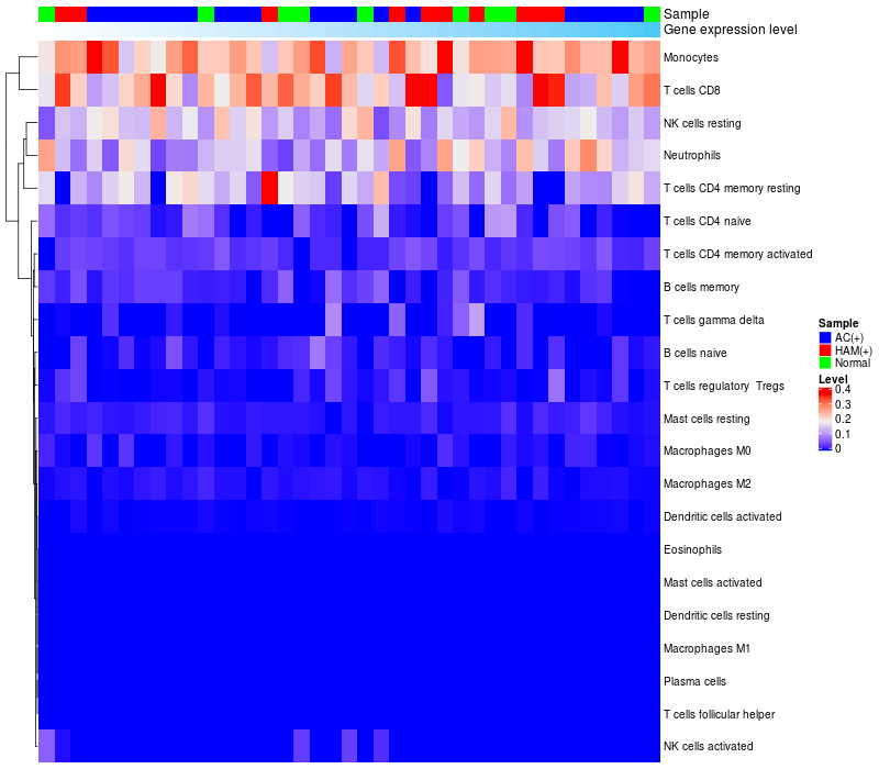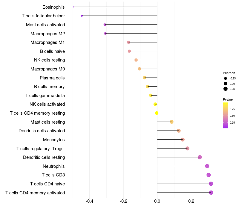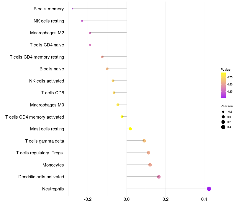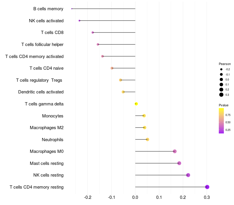 Lollipop of LY75 expression and immune infiltrating cell level correlation result in HTLV1+ samples