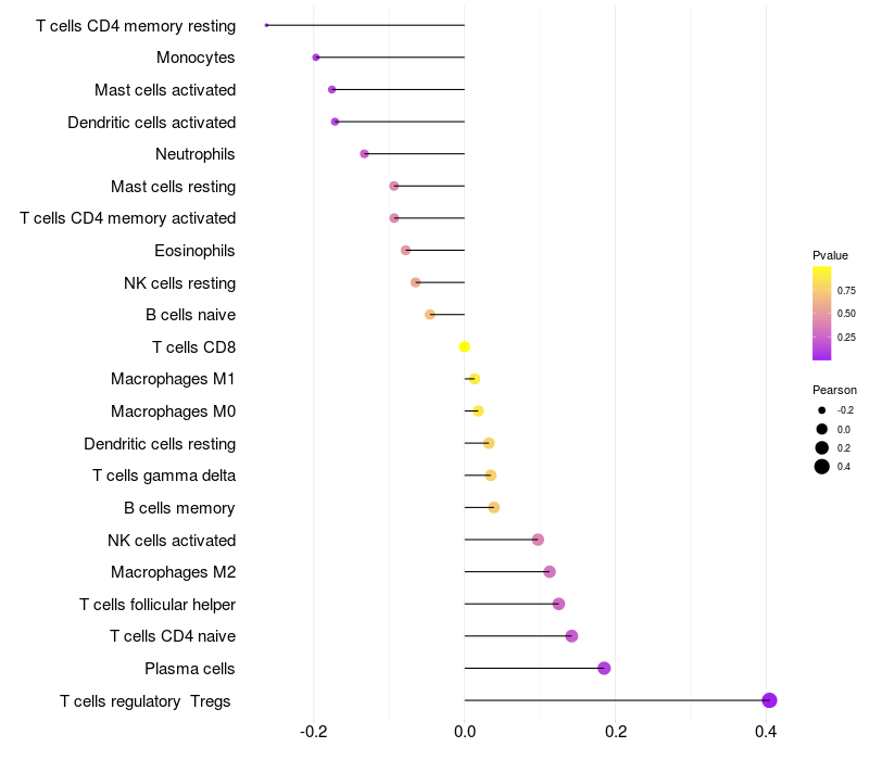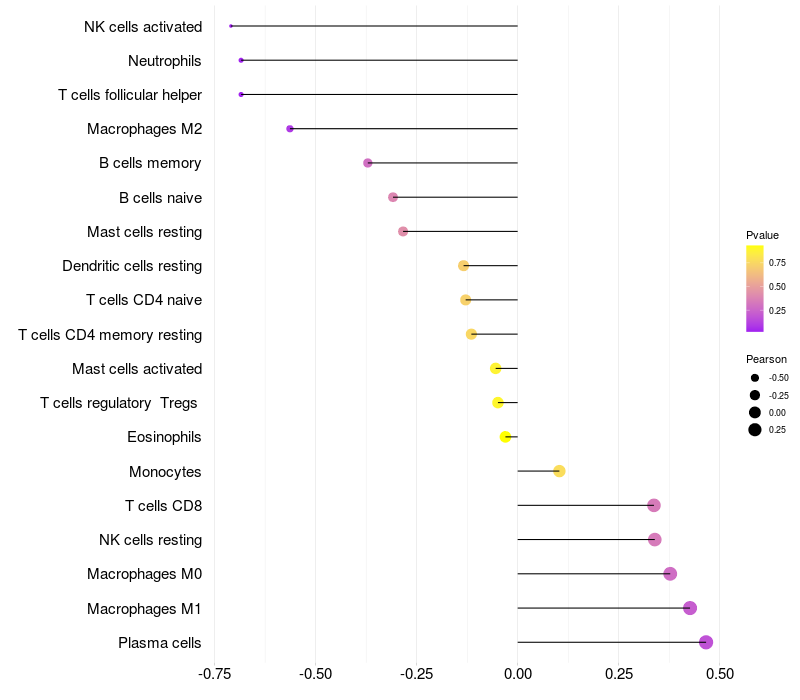 Lollipop of LYNX1 expression and immune infiltrating cell level correlation result in HBV+ Liver cirrhosis samples