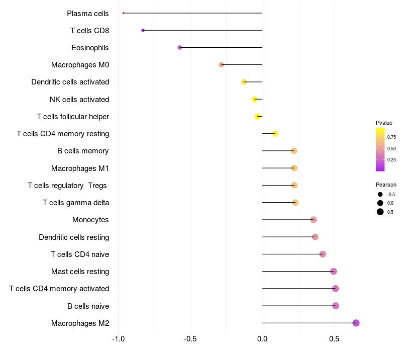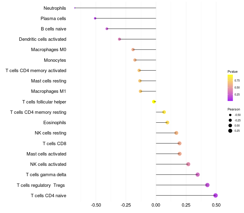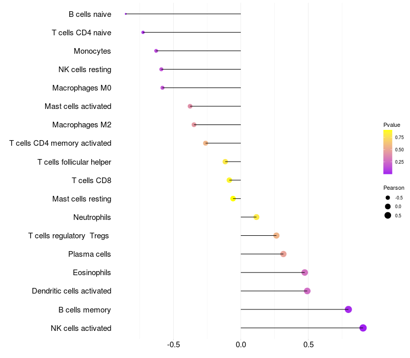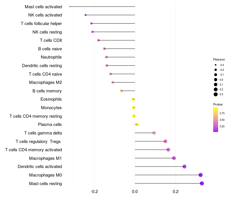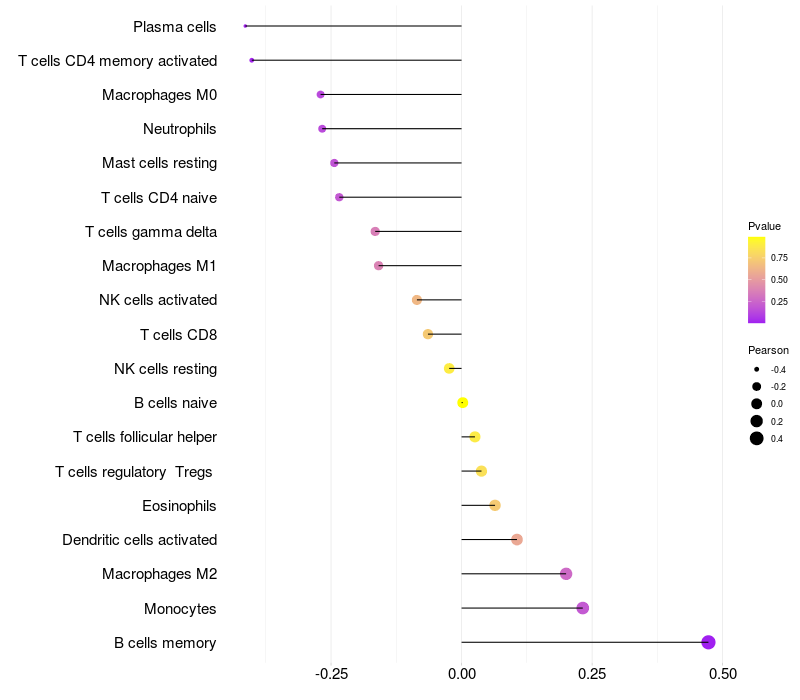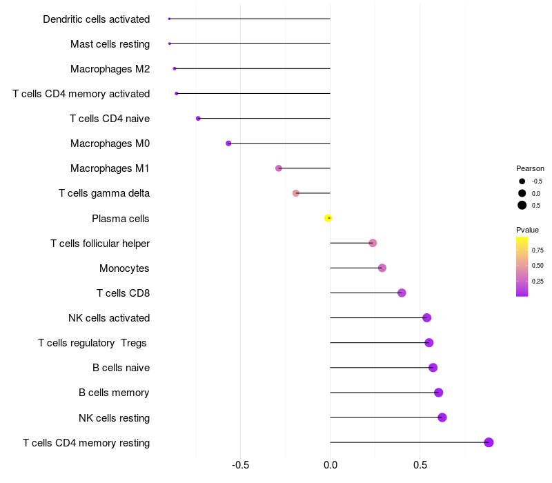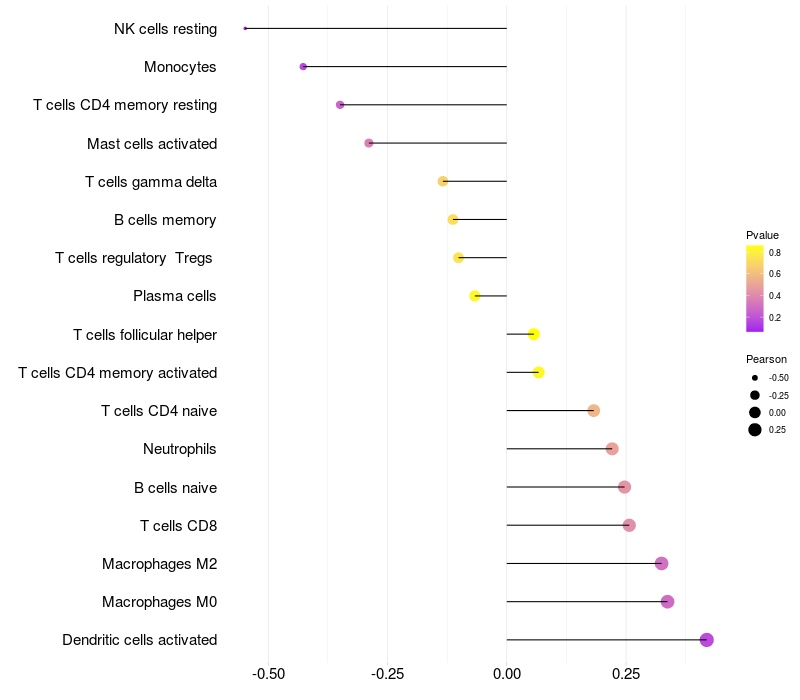Lollipop of LYRM7 expression and immune infiltrating cell level correlation result in EBV+ samples