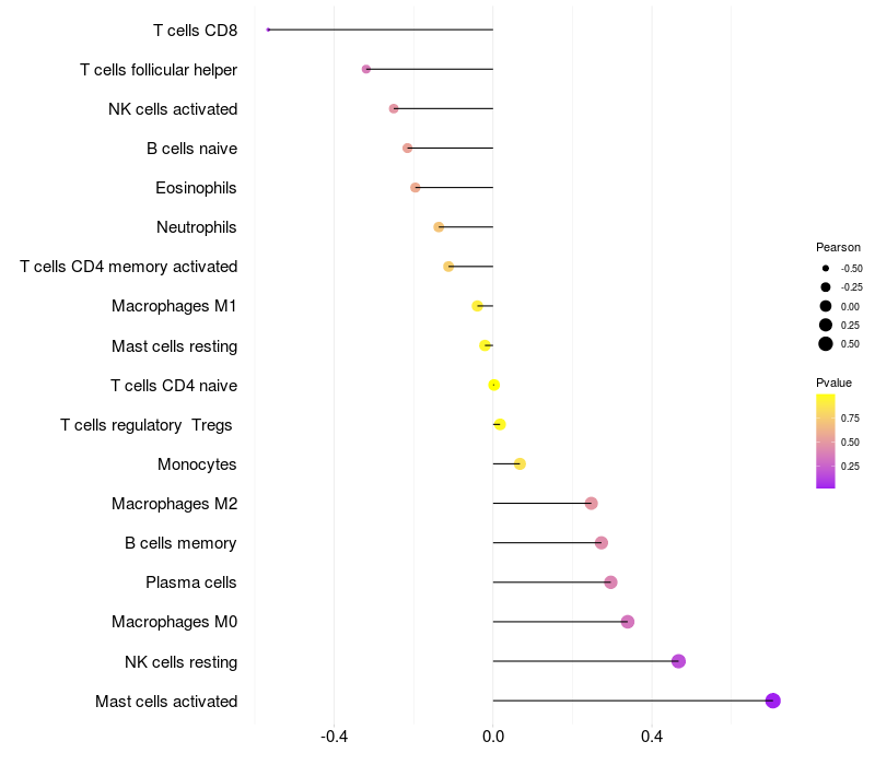 Lollipop of LYZ expression and immune infiltrating cell level correlation result in HBV+ samples