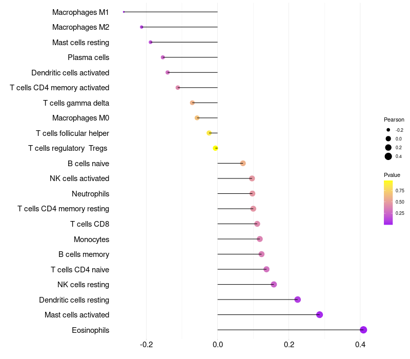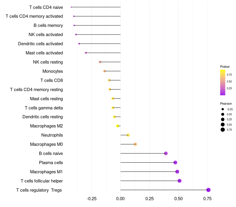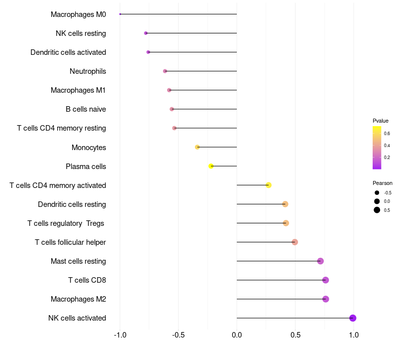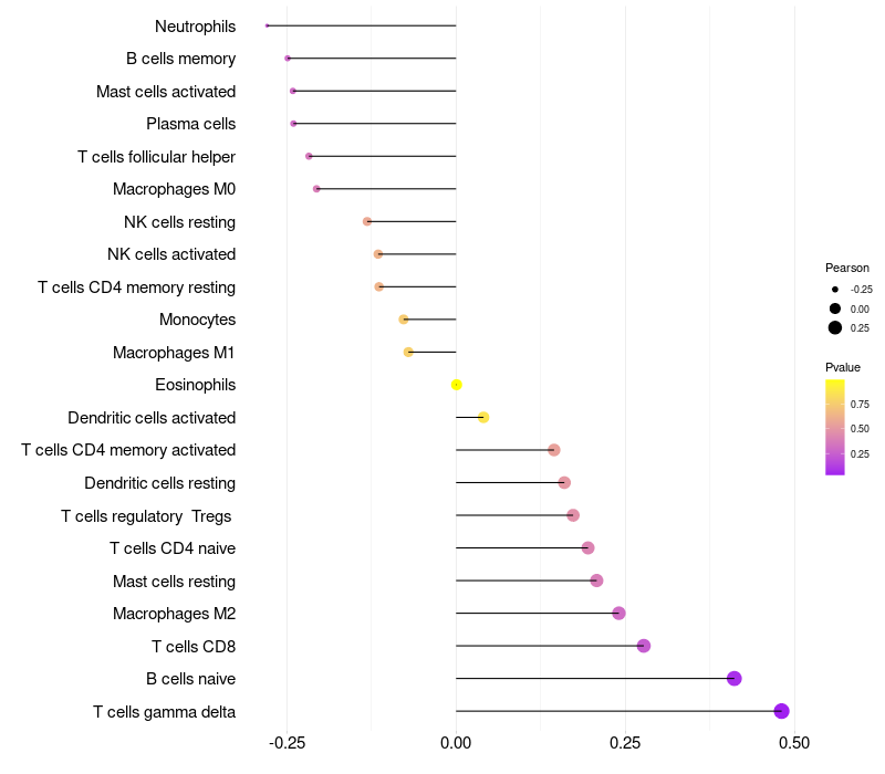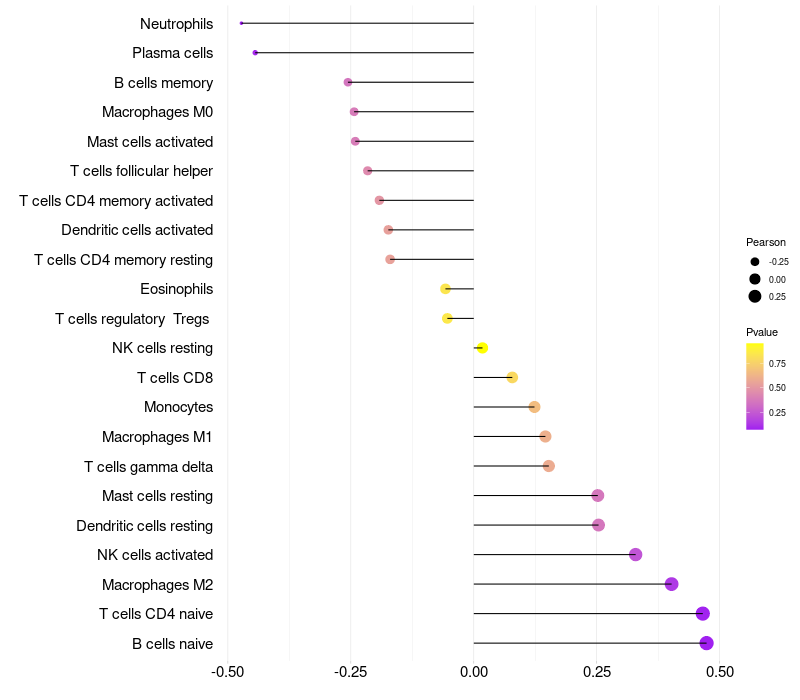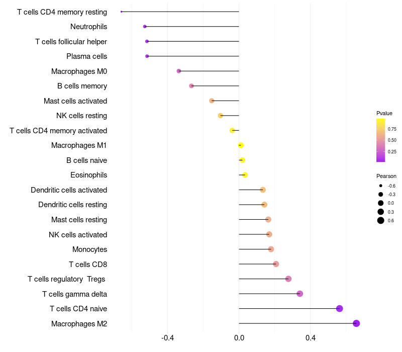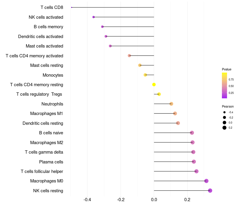 Lollipop of LYZL1 expression and immune infiltrating cell level correlation result in HPV+ samples