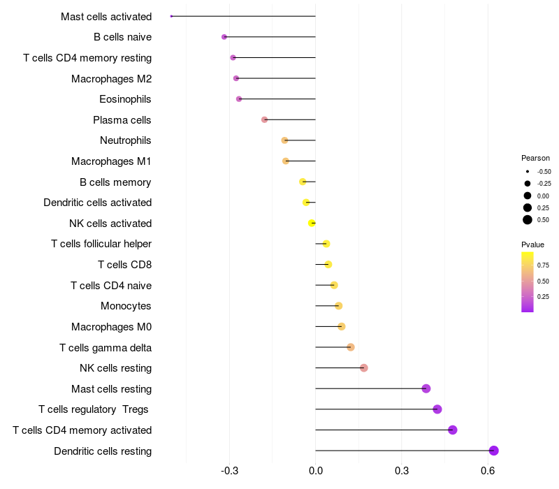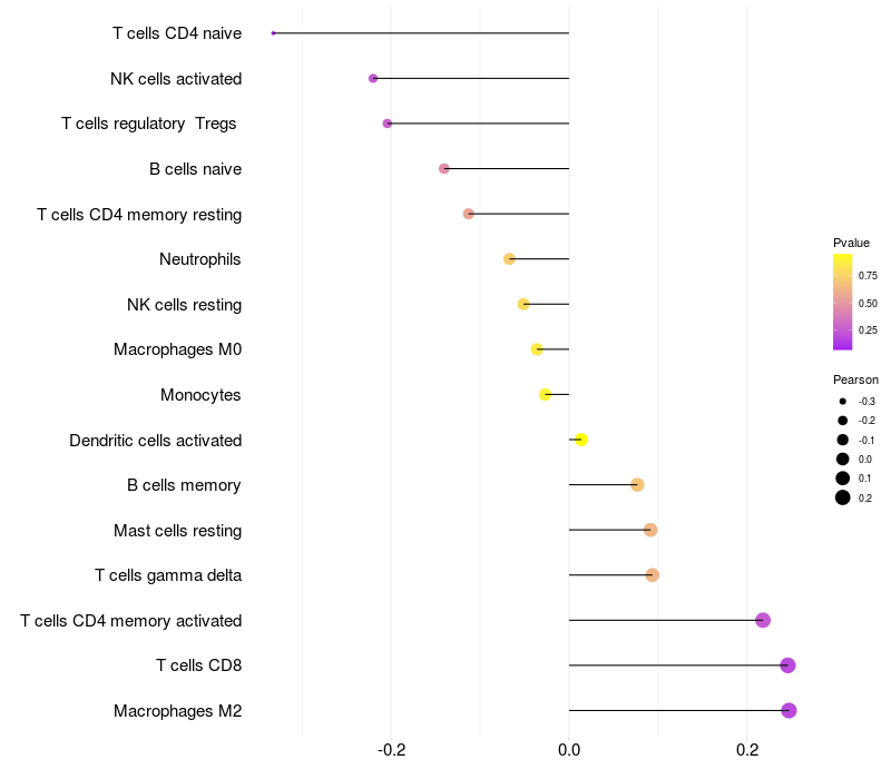 Lollipop of MAEL expression and immune infiltrating cell level correlation result in HTLV1+ samples