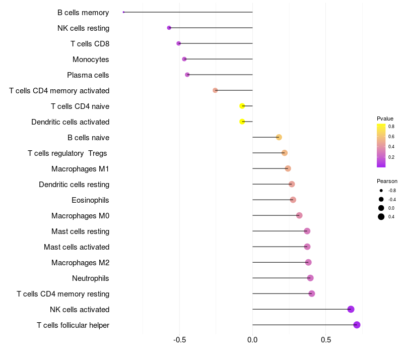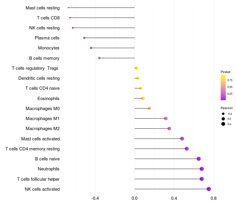 Lollipop of MAFF expression and immune infiltrating cell level correlation result in HBV+ samples