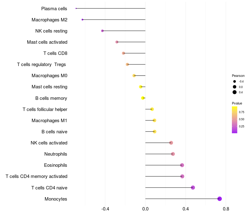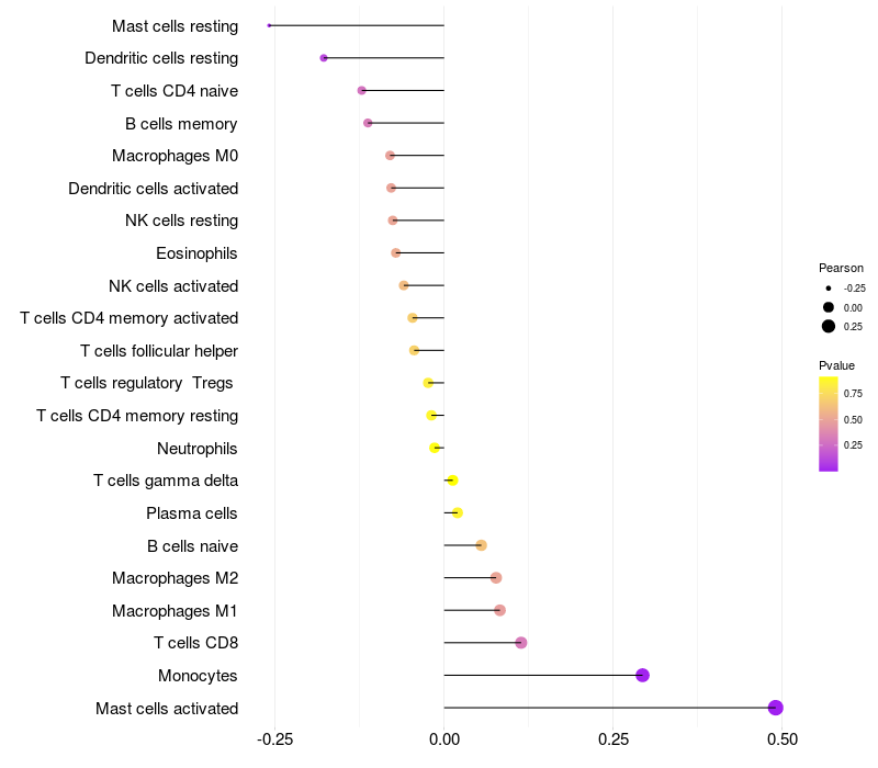 Lollipop of MAFF expression and immune infiltrating cell level correlation result in HBV+ Liver cirrhosis samples