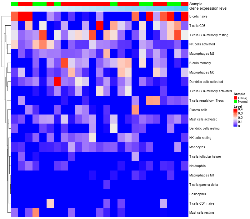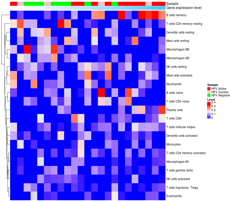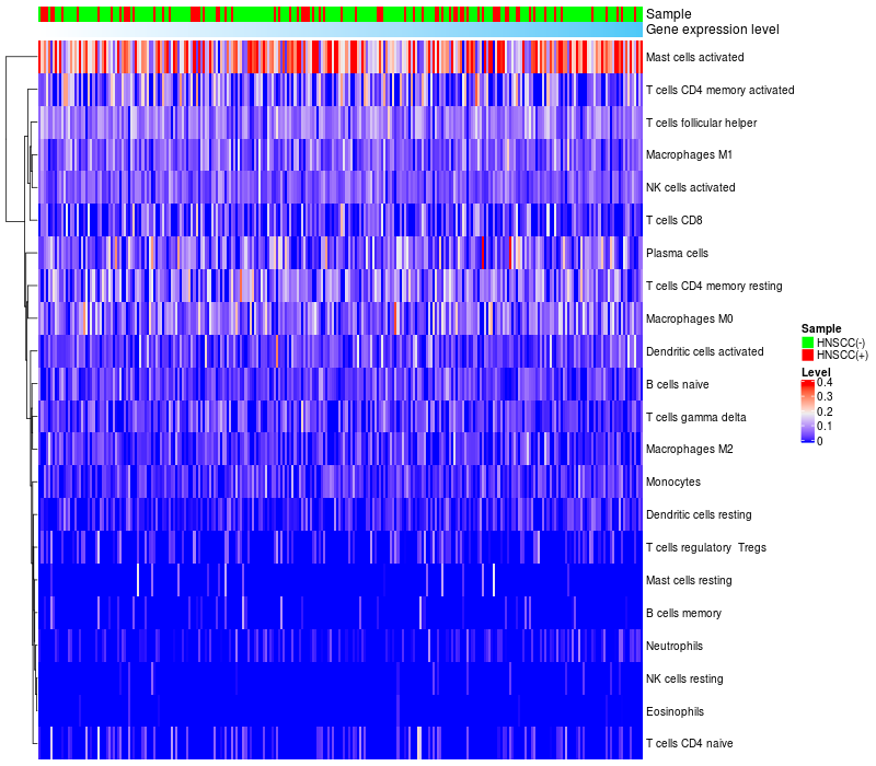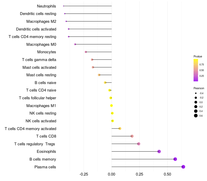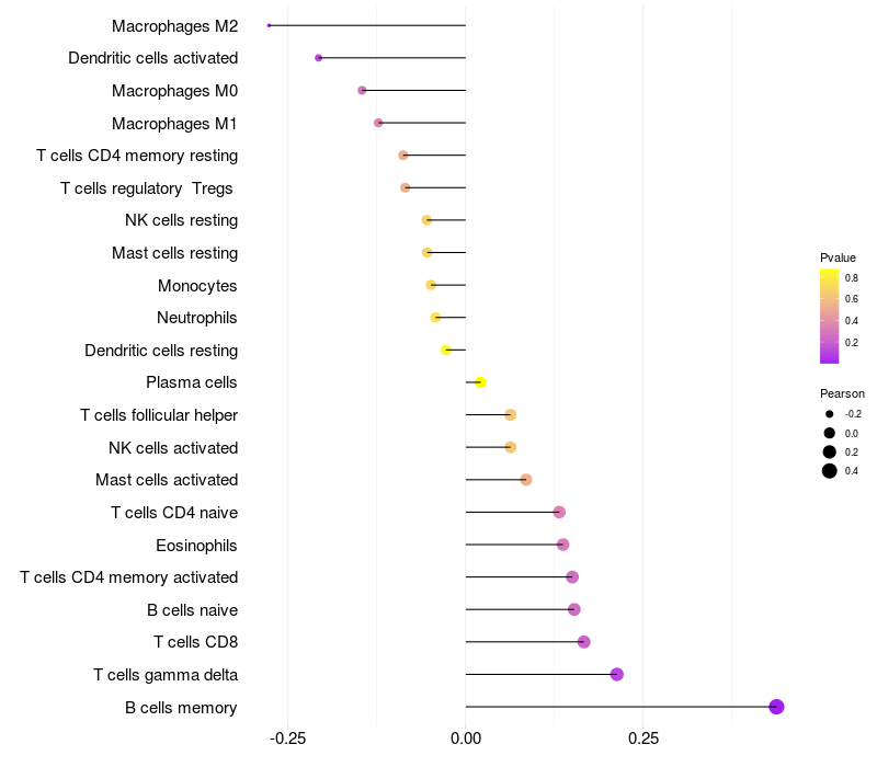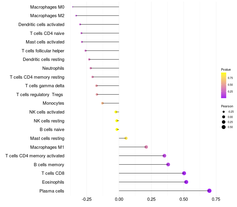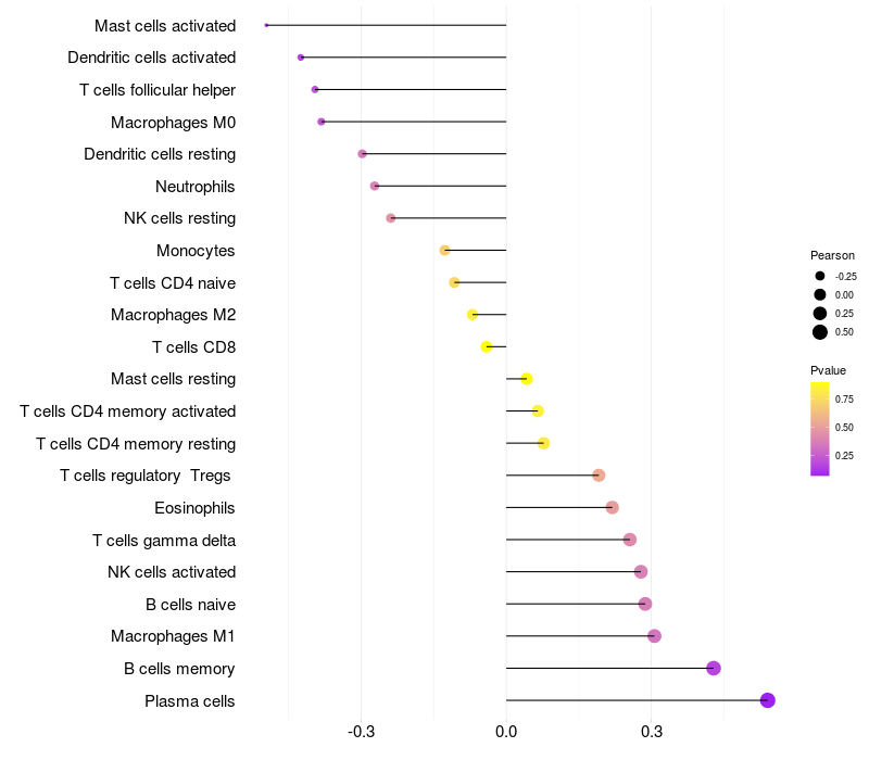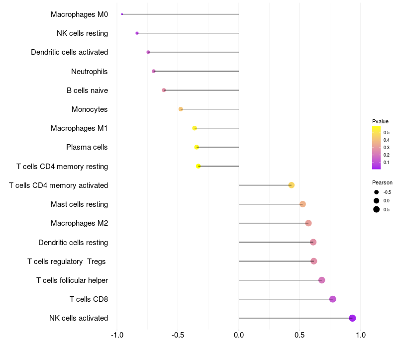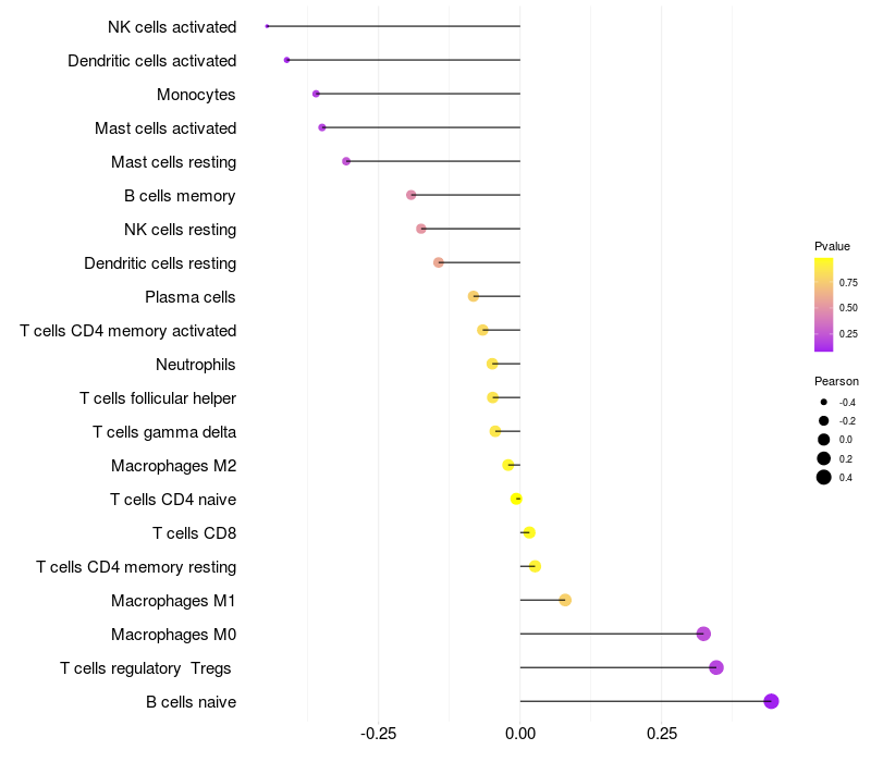 Lollipop of MAG expression and immune infiltrating cell level correlation result in HPV+ samples