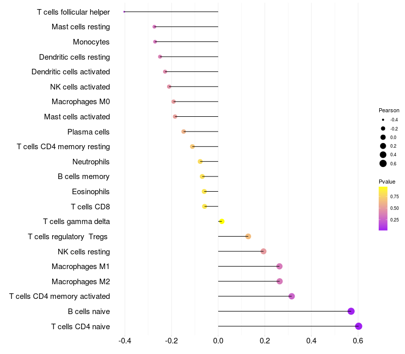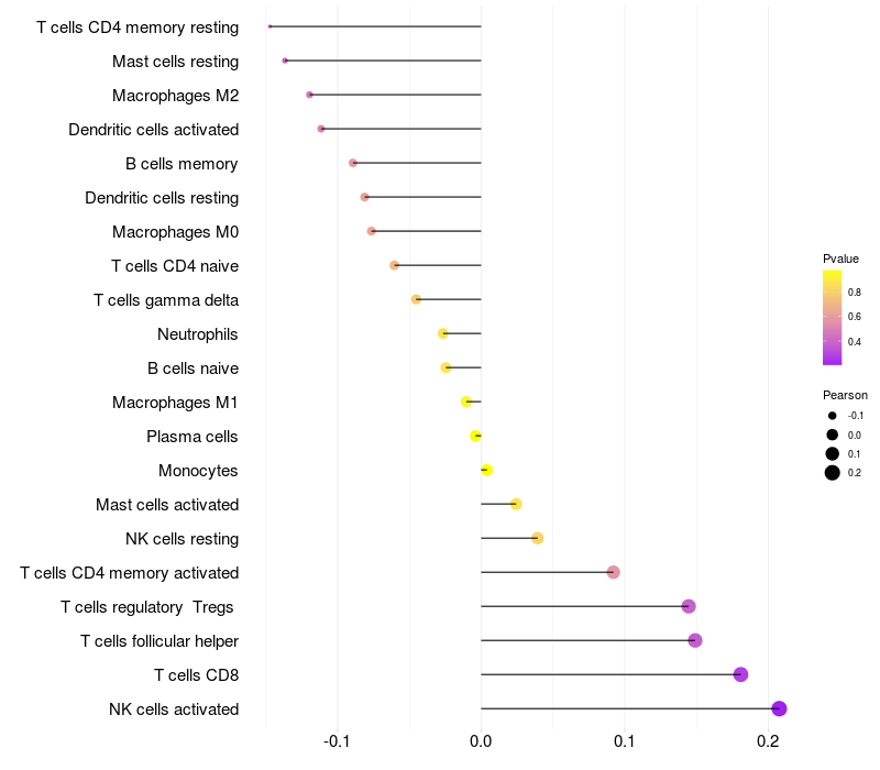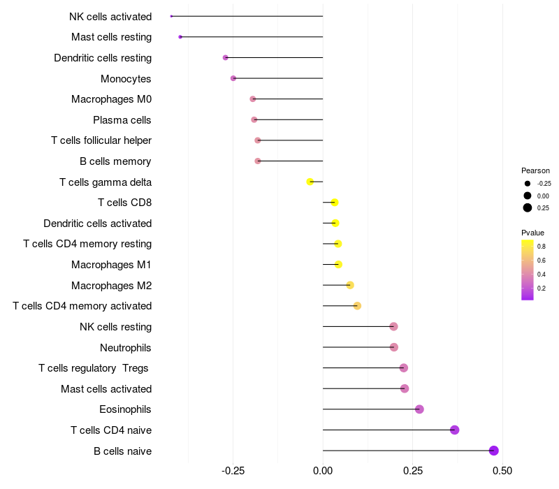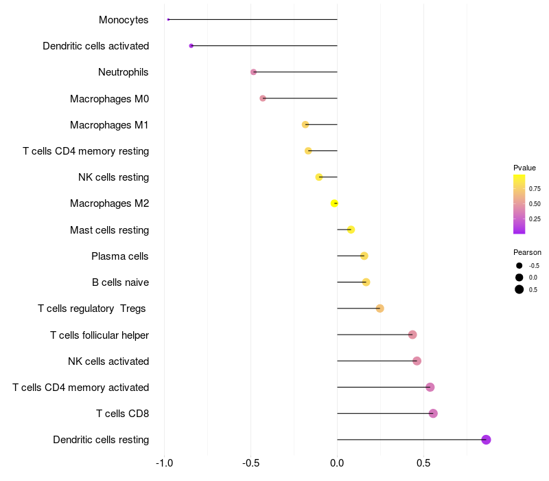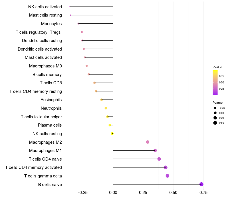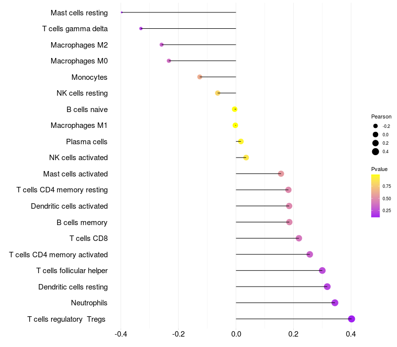 Lollipop of MAGEB16 expression and immune infiltrating cell level correlation result in HPV+ samples