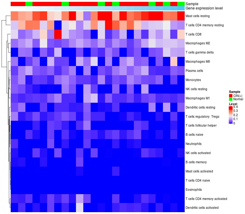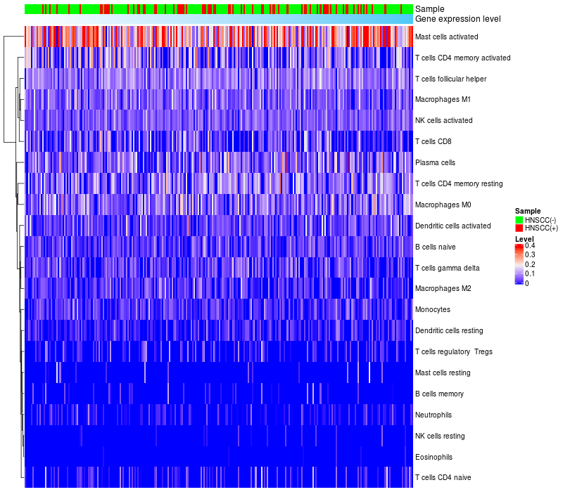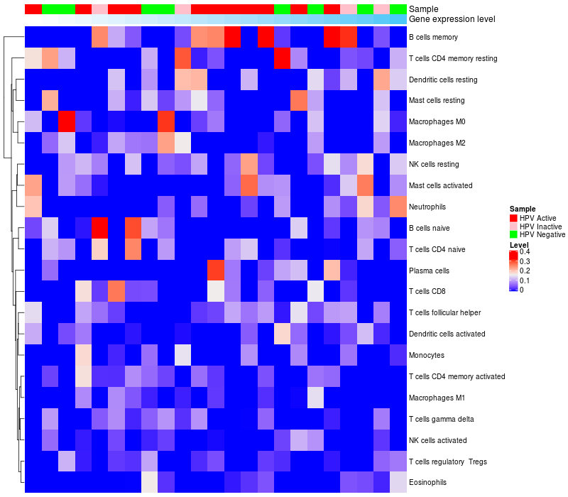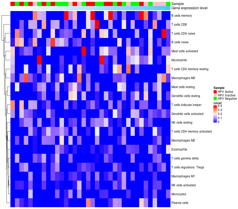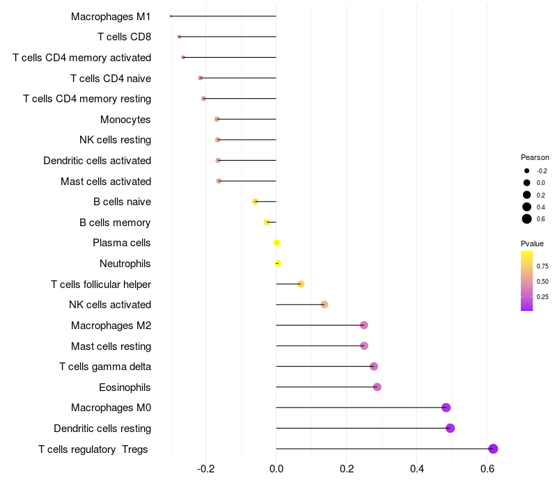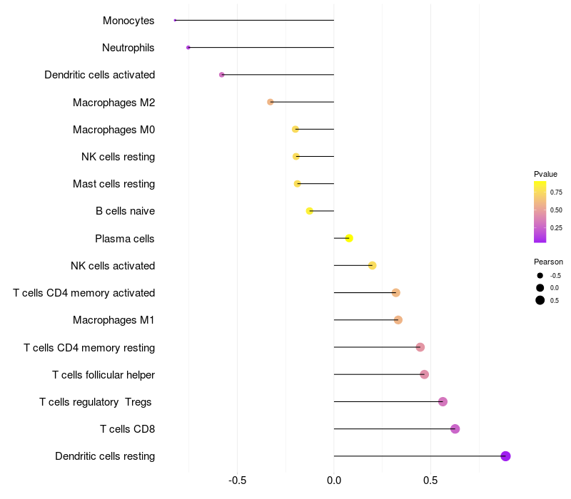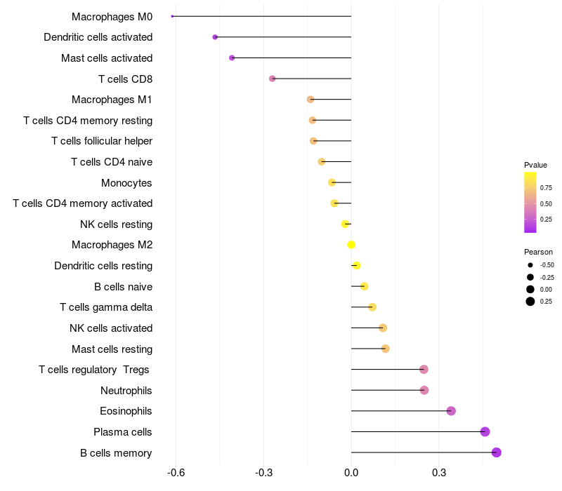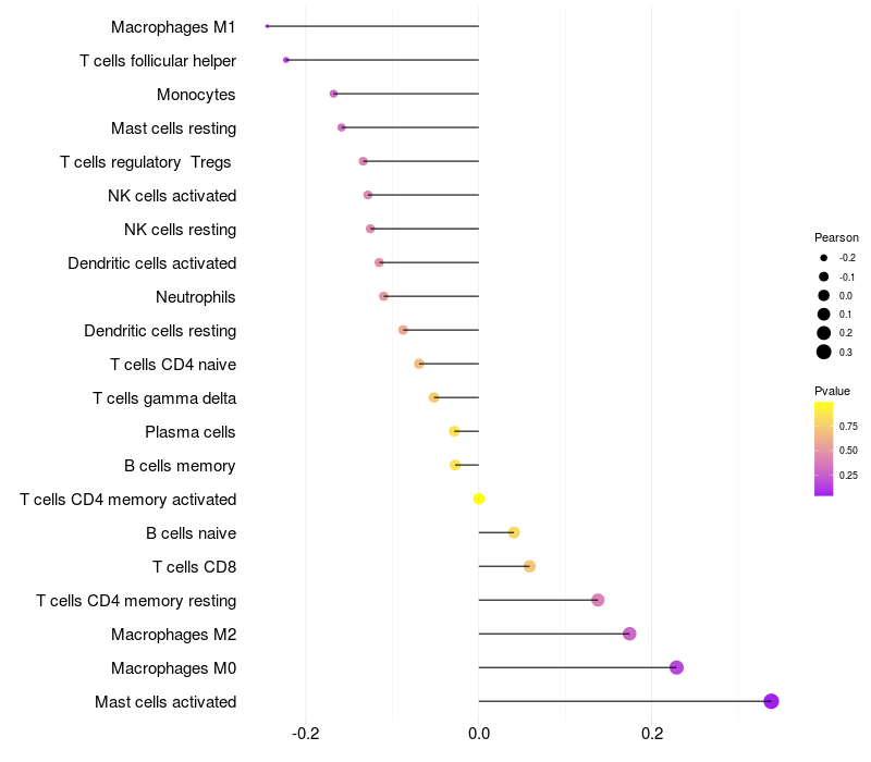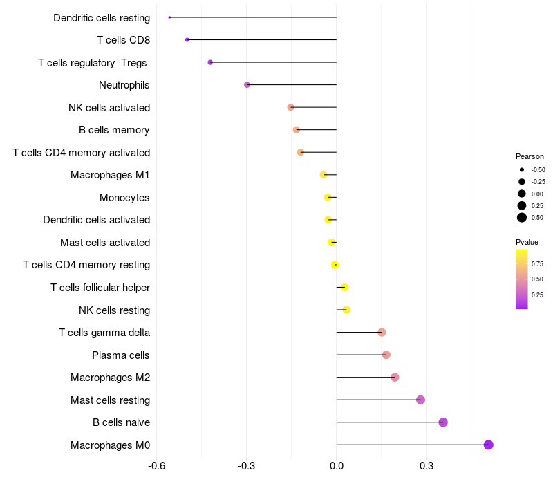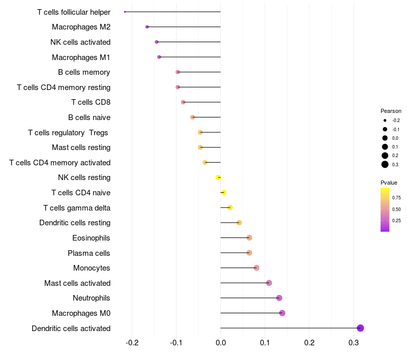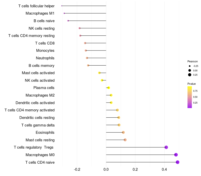 Lollipop of MAGEB2 expression and immune infiltrating cell level correlation result in HPV+ samples