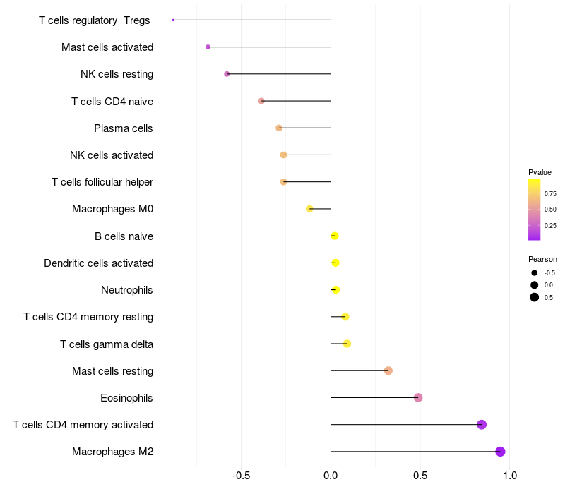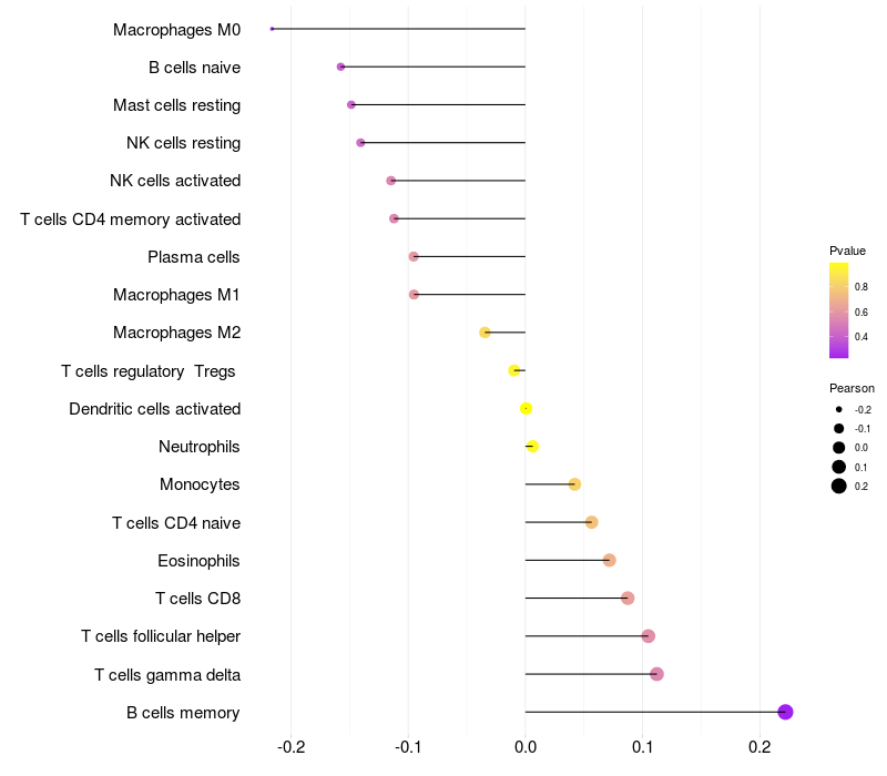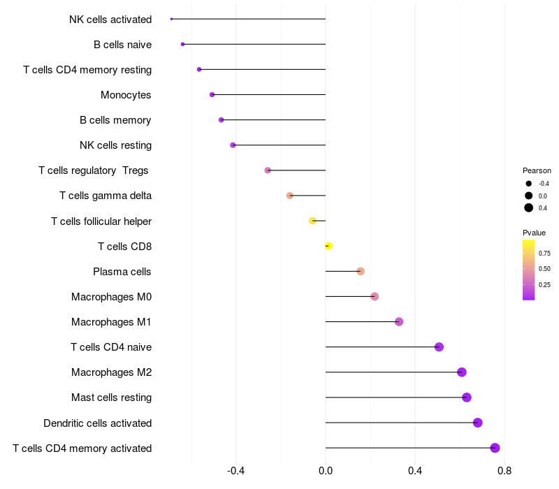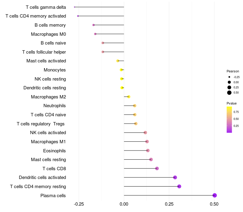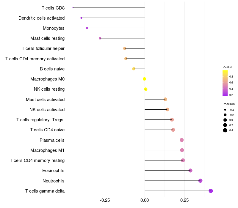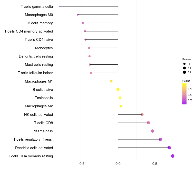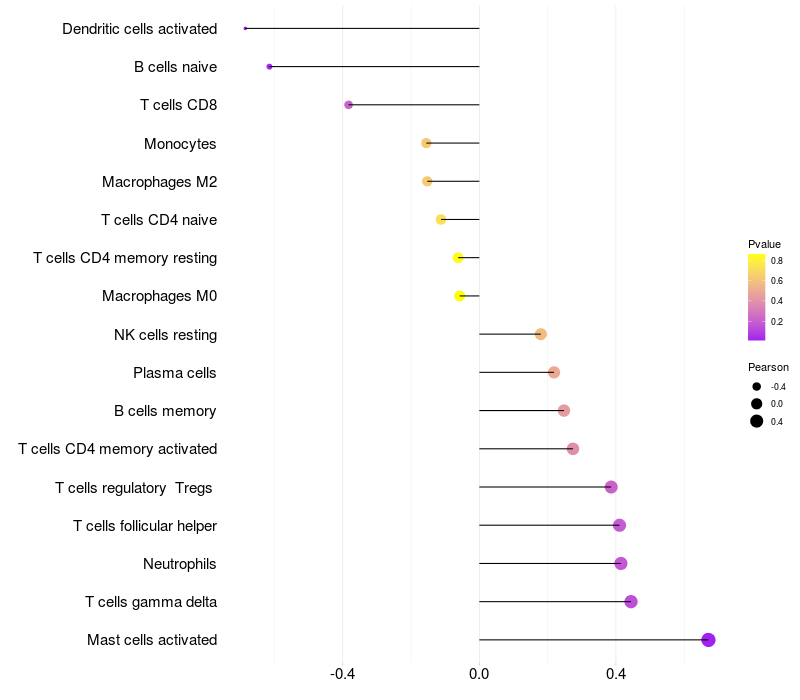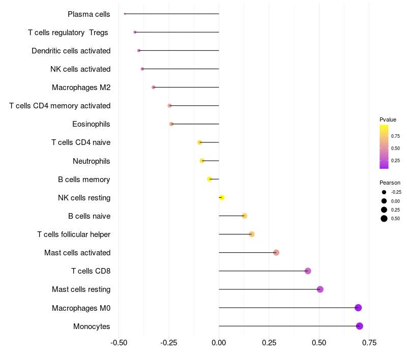 Lollipop of MAGI2 expression and immune infiltrating cell level correlation result in EBV+ samples