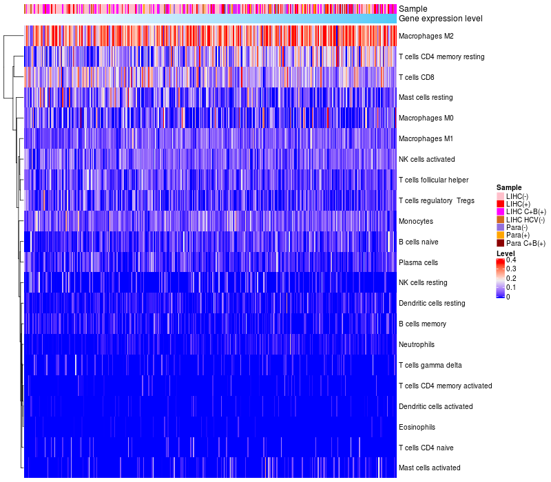 Liver hepatocellular carcinoma HCV (HBV+)(86), Liver hepatocellular carcinoma HCV (HBV-)(19), Liver hepatocellular carcinoma (HBV+)(209), Liver hepatocellular carcinoma (HBV+)(60), Paracancerous HCV (HBV+)(4), Paracancerous (HBV-)(28), Paracancerous (HBV+)(18) |