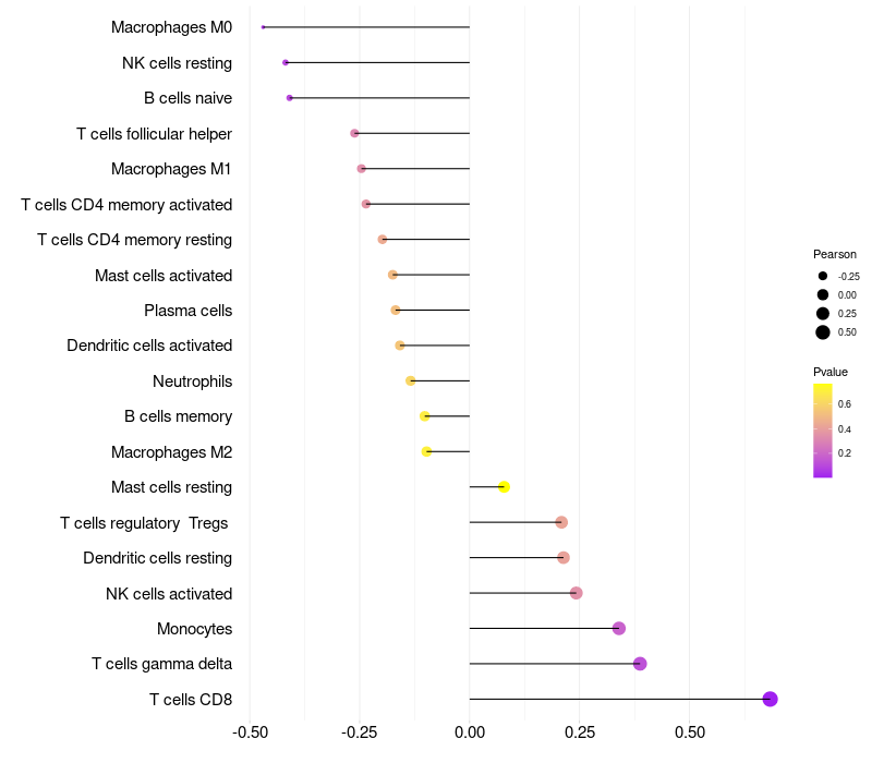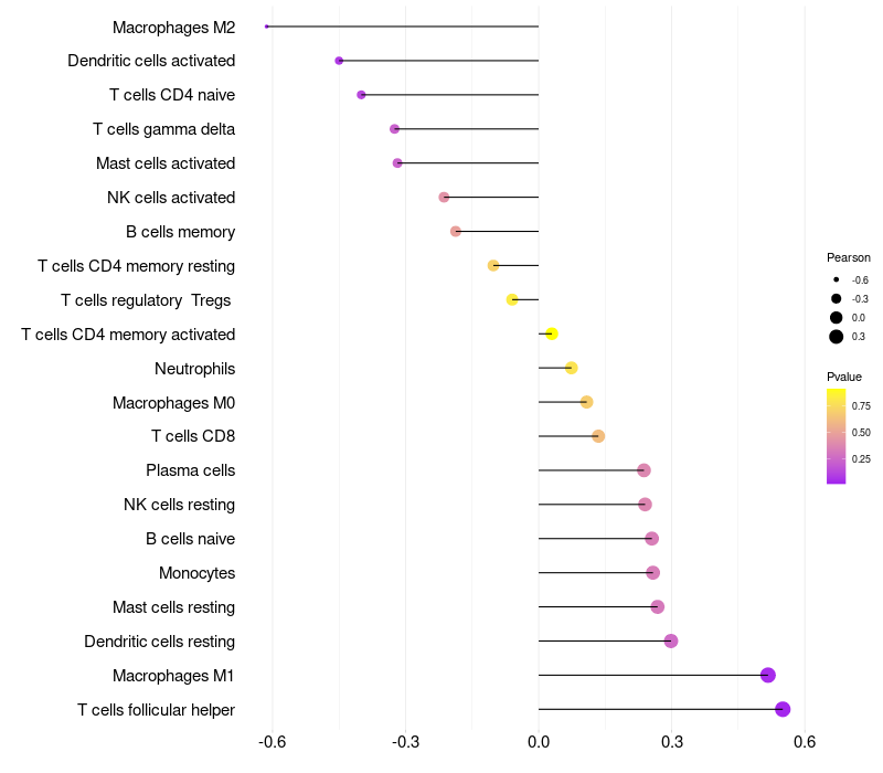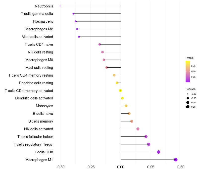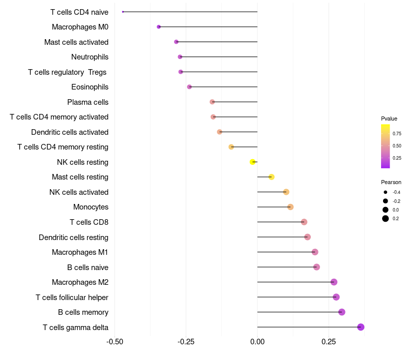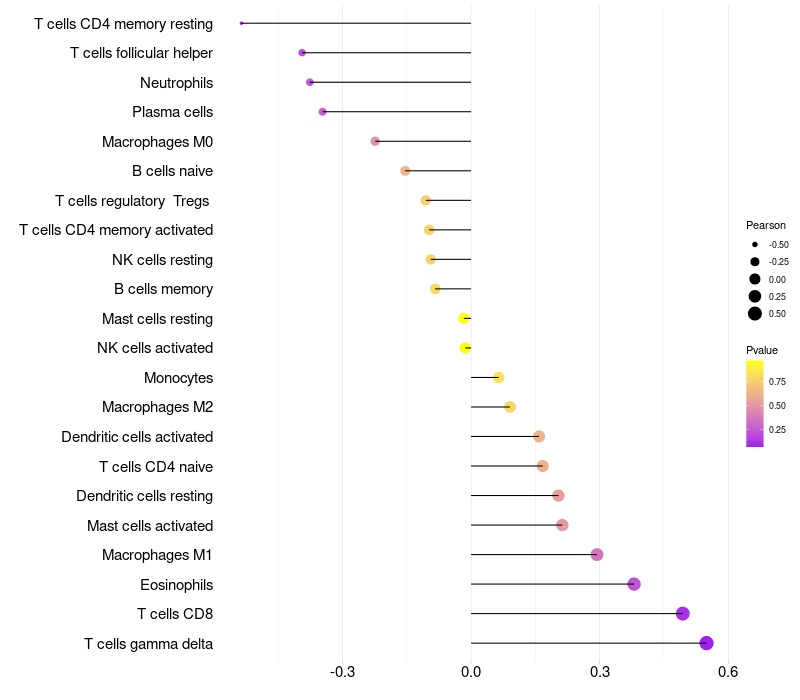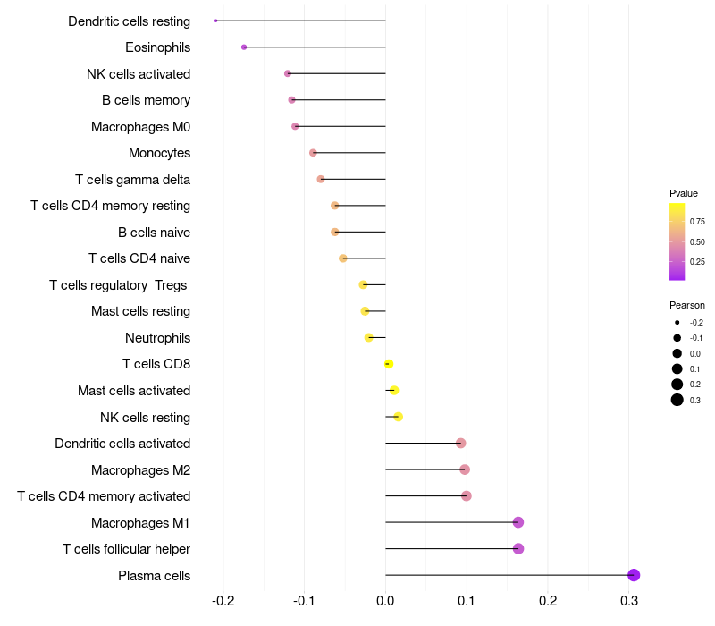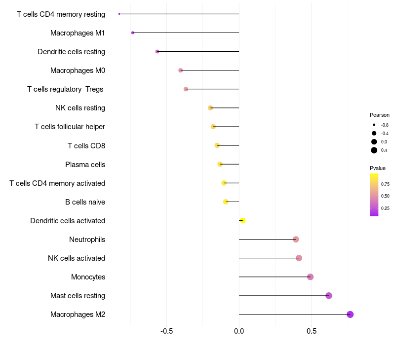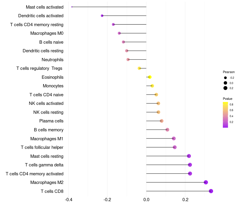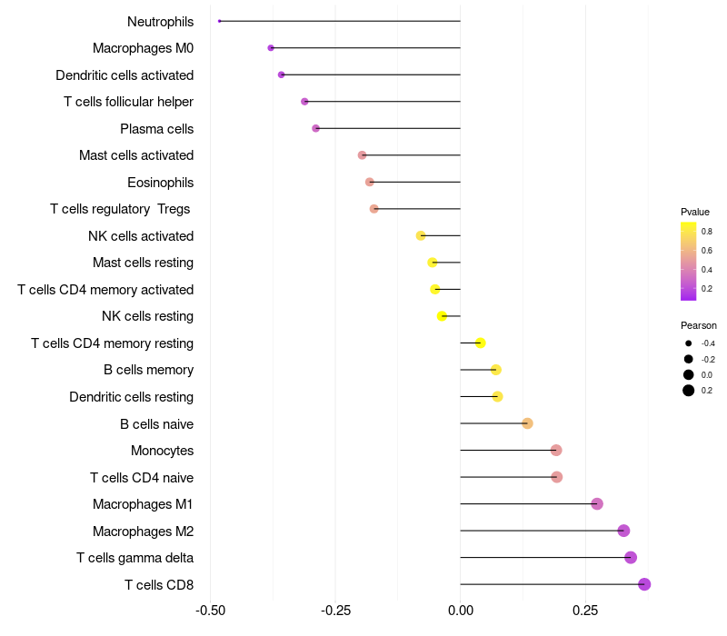 Lollipop of MAN2B2 expression and immune infiltrating cell level correlation result in HPV+ samples