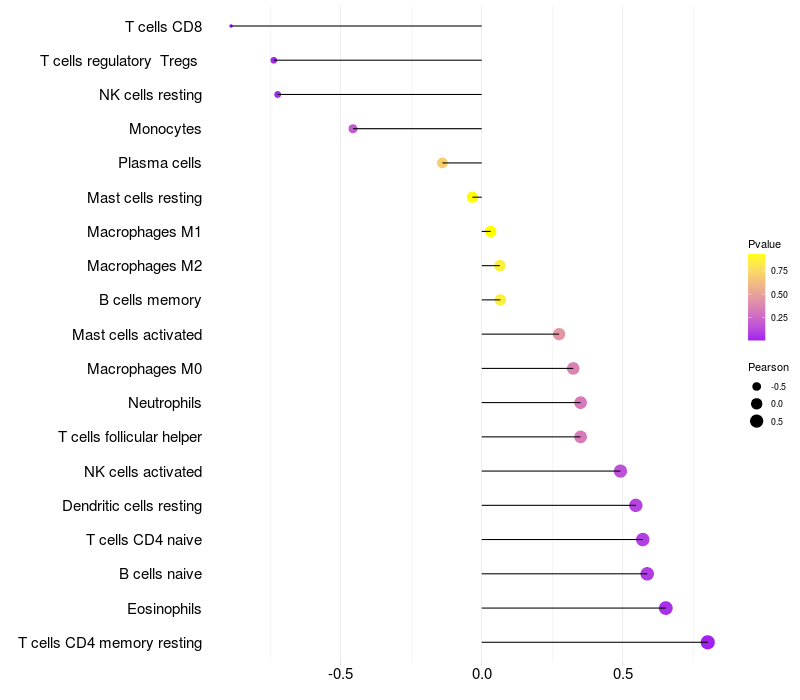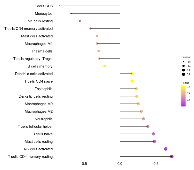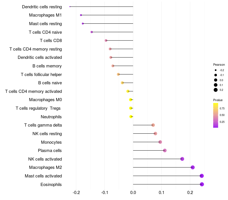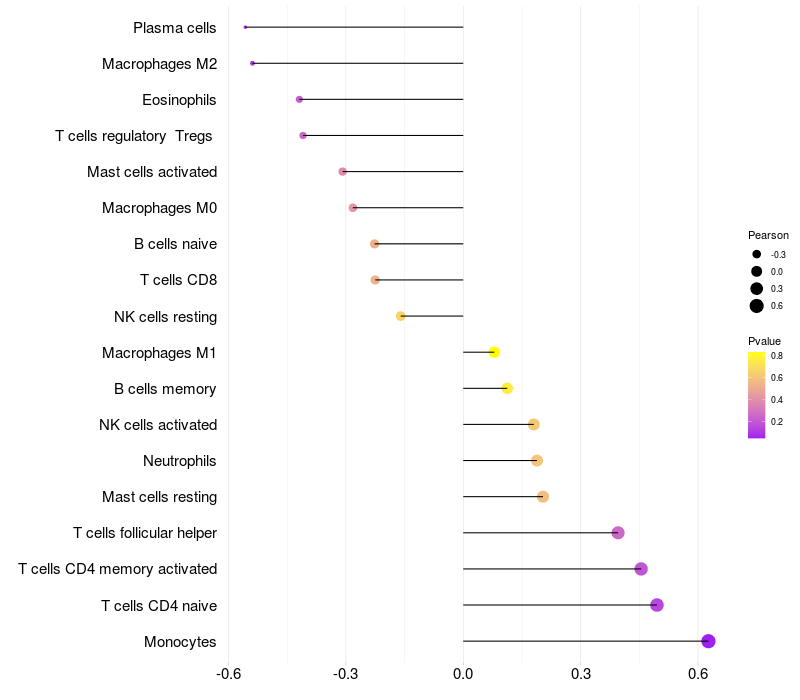 Lollipop of MAP1LC3B expression and immune infiltrating cell level correlation result in HBV+ Liver cirrhosis samples