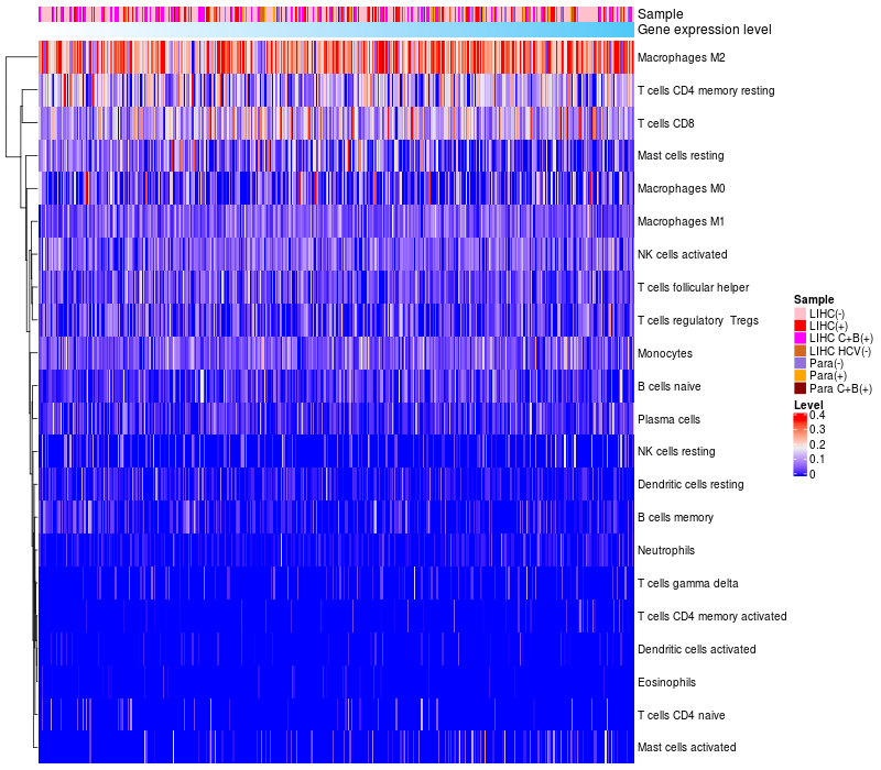 Liver hepatocellular carcinoma HCV (HBV+)(86), Liver hepatocellular carcinoma HCV (HBV-)(19), Liver hepatocellular carcinoma (HBV+)(209), Liver hepatocellular carcinoma (HBV+)(60), Paracancerous HCV (HBV+)(4), Paracancerous (HBV-)(28), Paracancerous (HBV+)(18) |