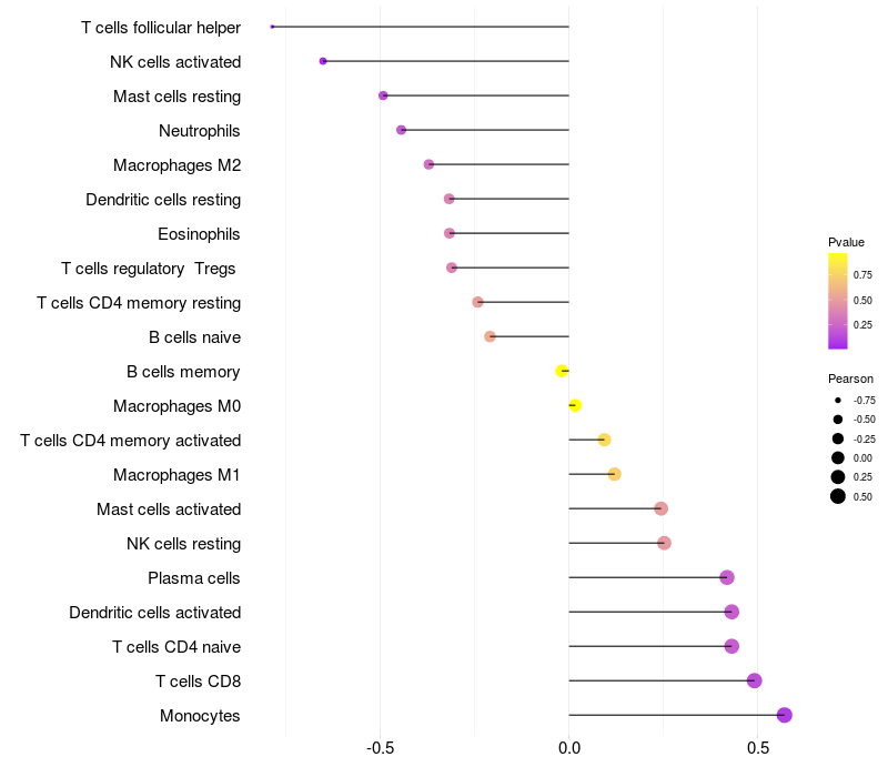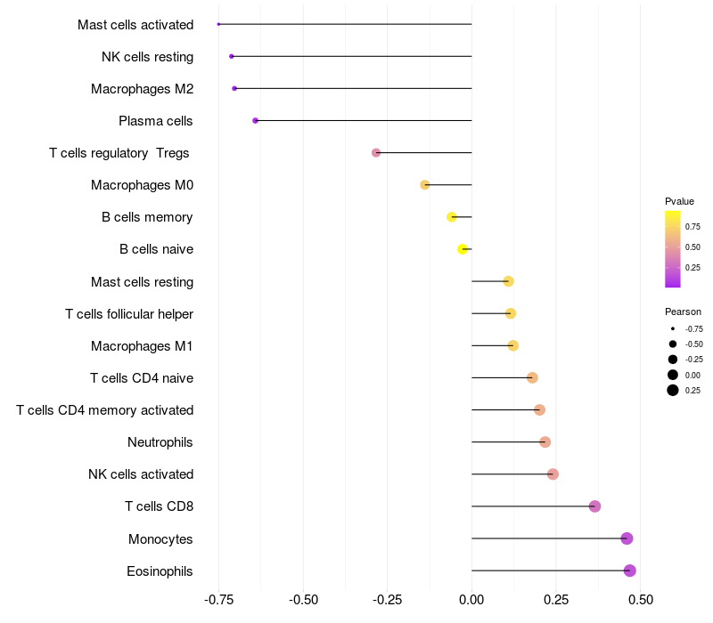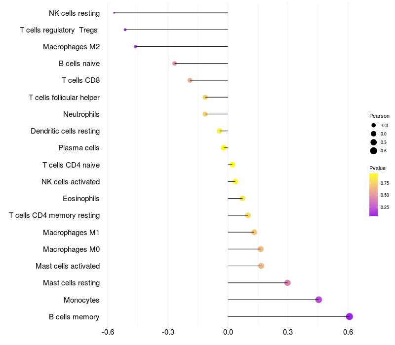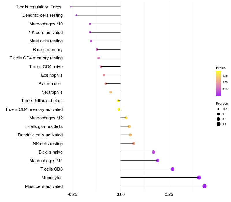 Lollipop of MAP2K3 expression and immune infiltrating cell level correlation result in HBV+ Liver cirrhosis samples