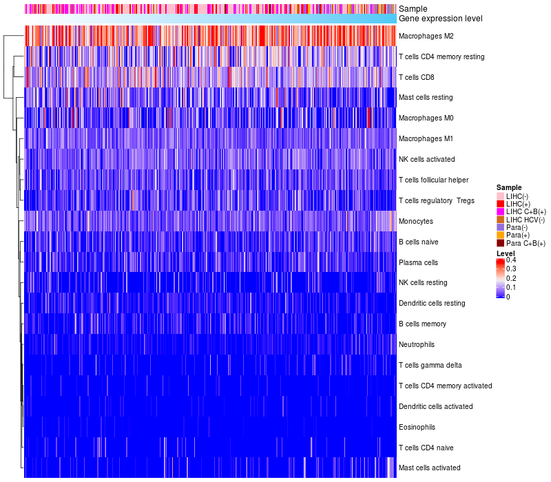Liver hepatocellular carcinoma HCV (HBV+)(86), Liver hepatocellular carcinoma HCV (HBV-)(19), Liver hepatocellular carcinoma (HBV+)(209), Liver hepatocellular carcinoma (HBV+)(60), Paracancerous HCV (HBV+)(4), Paracancerous (HBV-)(28), Paracancerous (HBV+)(18) |