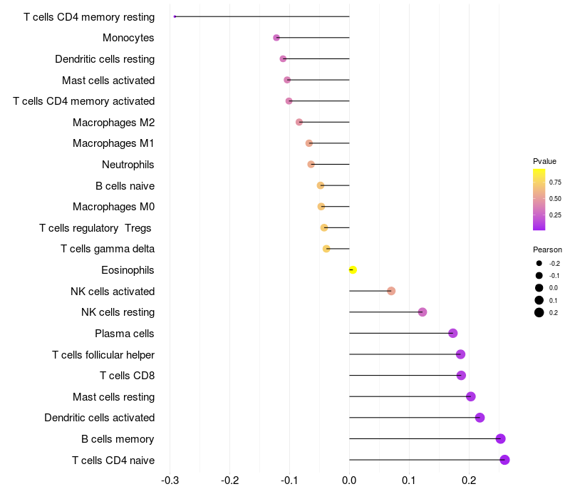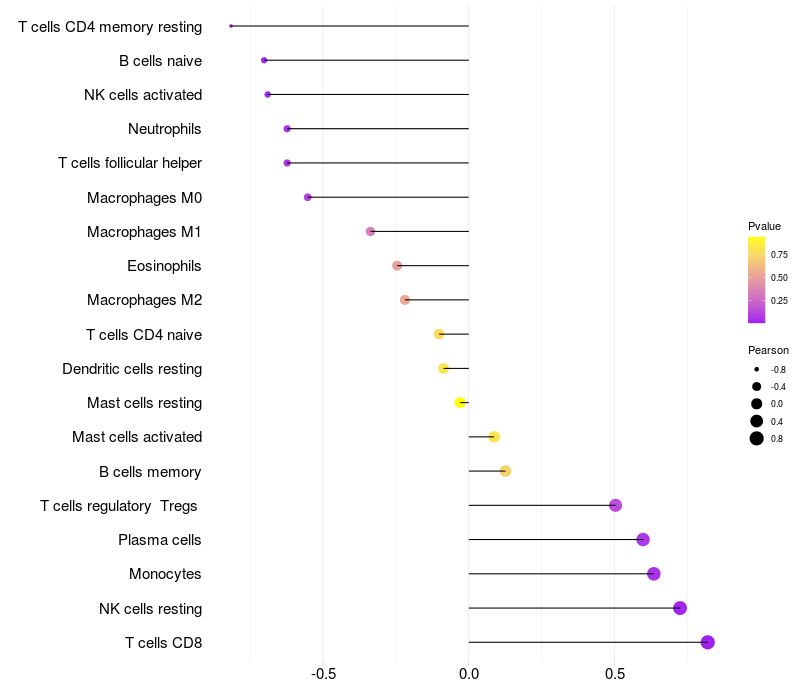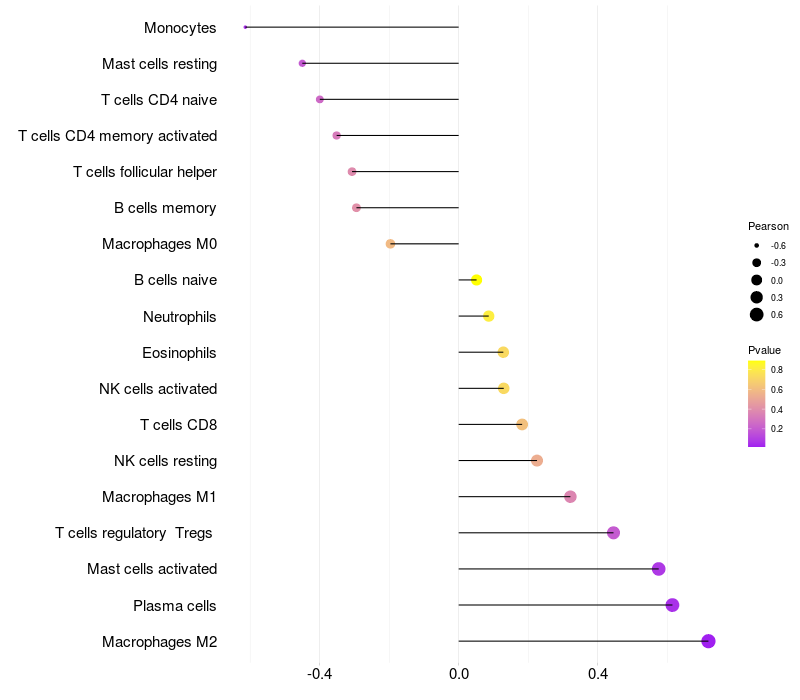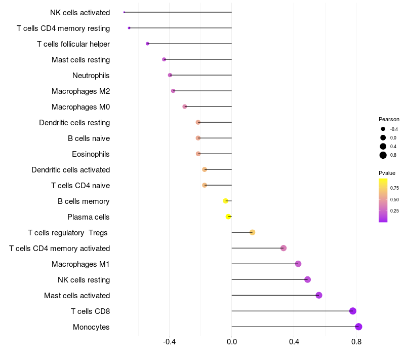 Lollipop of MAP2K7 expression and immune infiltrating cell level correlation result in HBV+ Liver cirrhosis samples