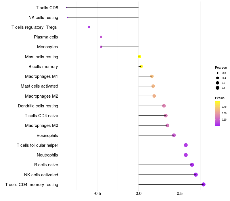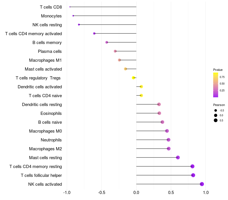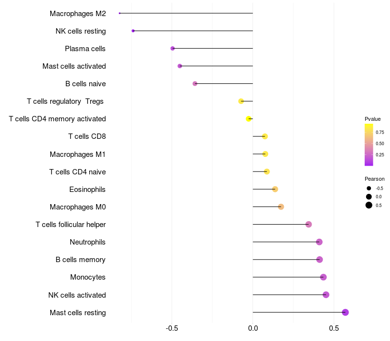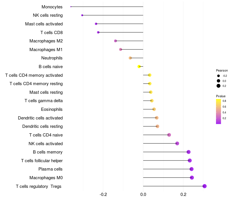 Lollipop of MAP4K4 expression and immune infiltrating cell level correlation result in HBV+ Liver cirrhosis samples