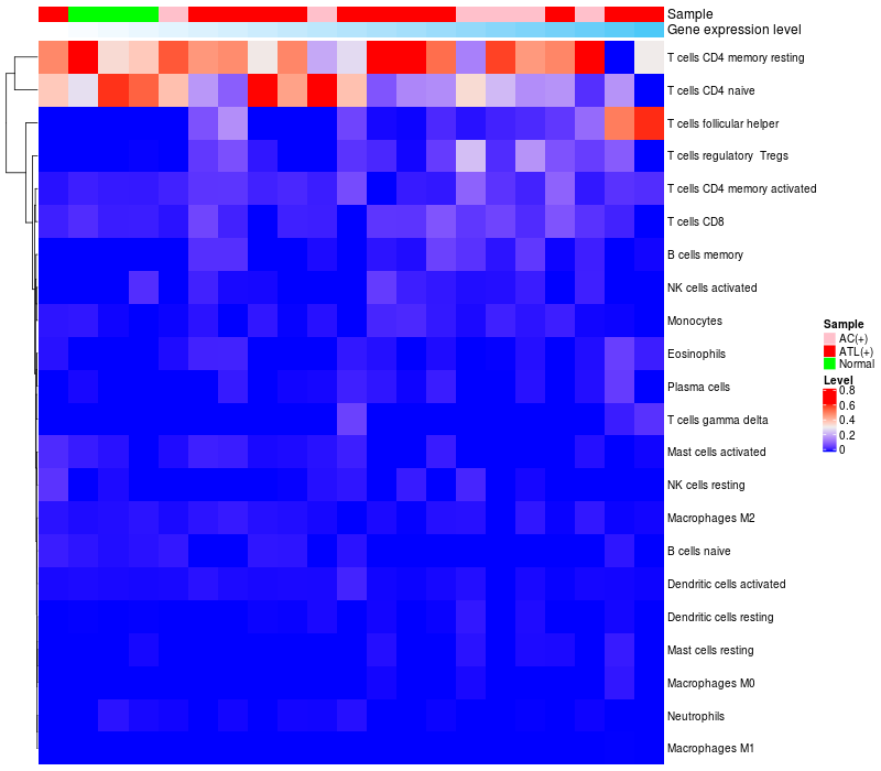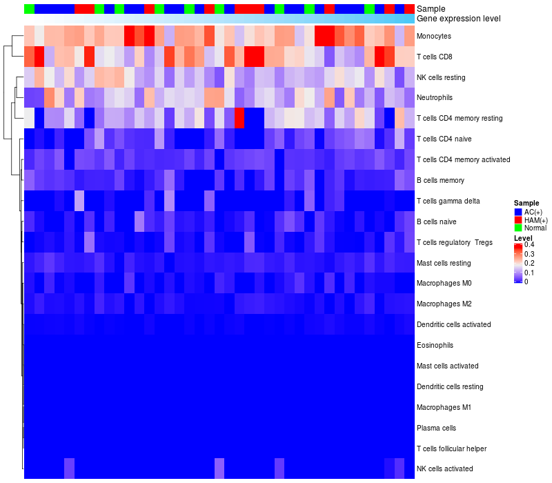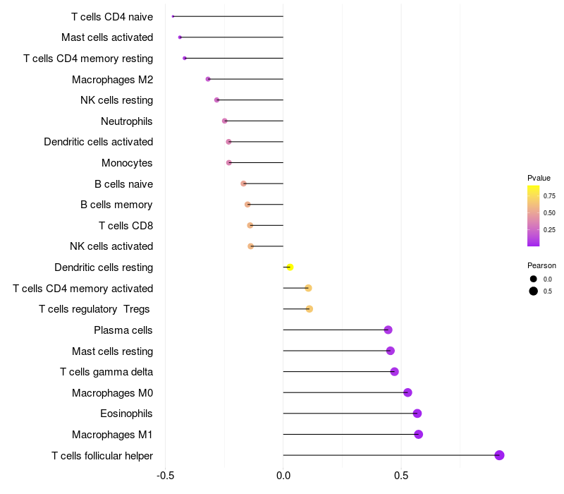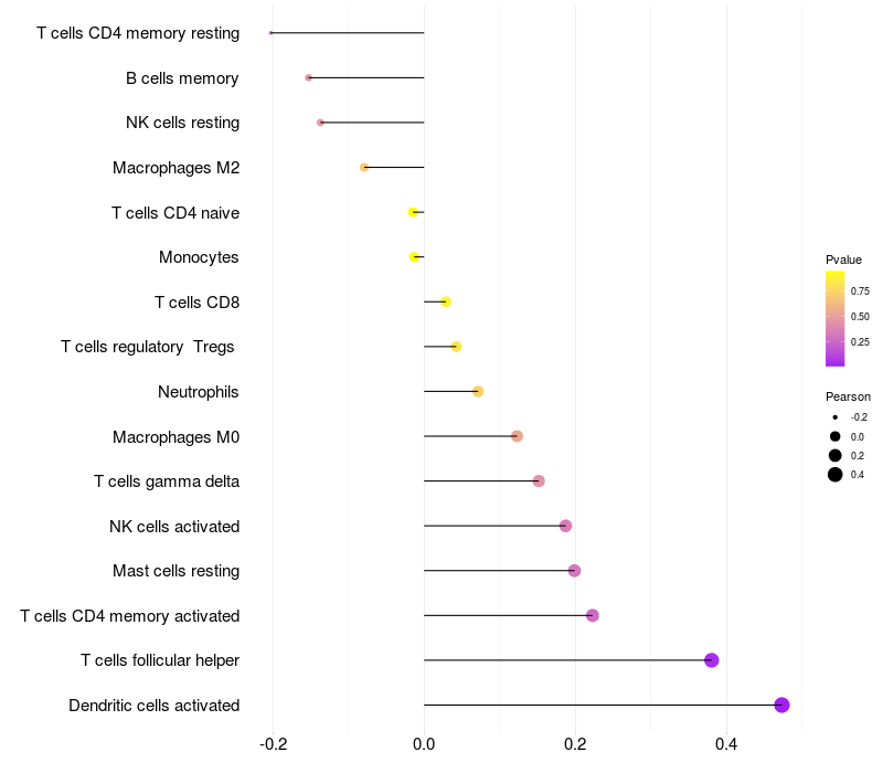 Lollipop of MAP6 expression and immune infiltrating cell level correlation result in HTLV1+ samples