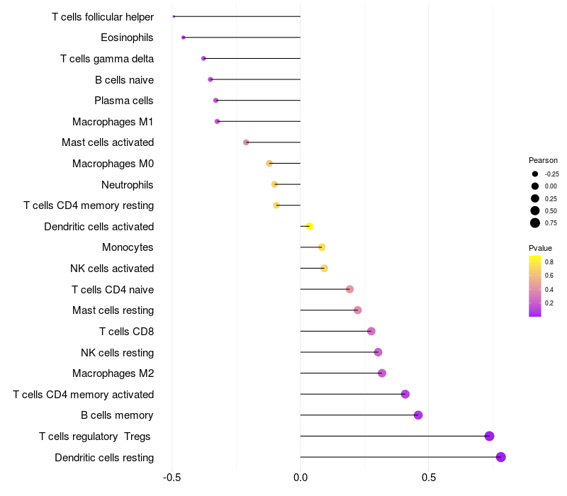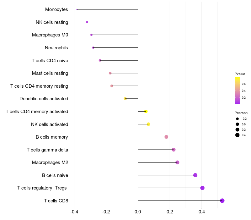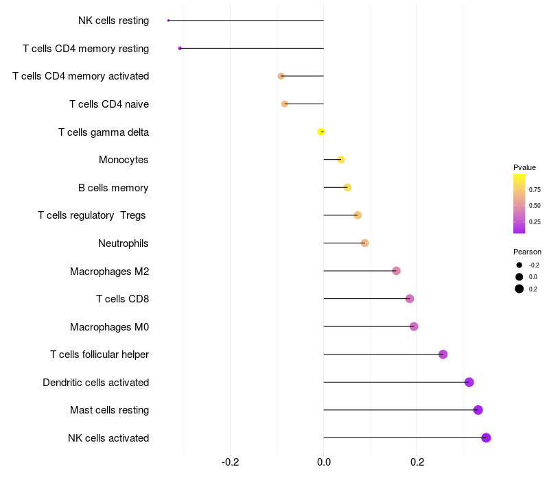 Lollipop of MAPK13 expression and immune infiltrating cell level correlation result in HTLV1+ samples