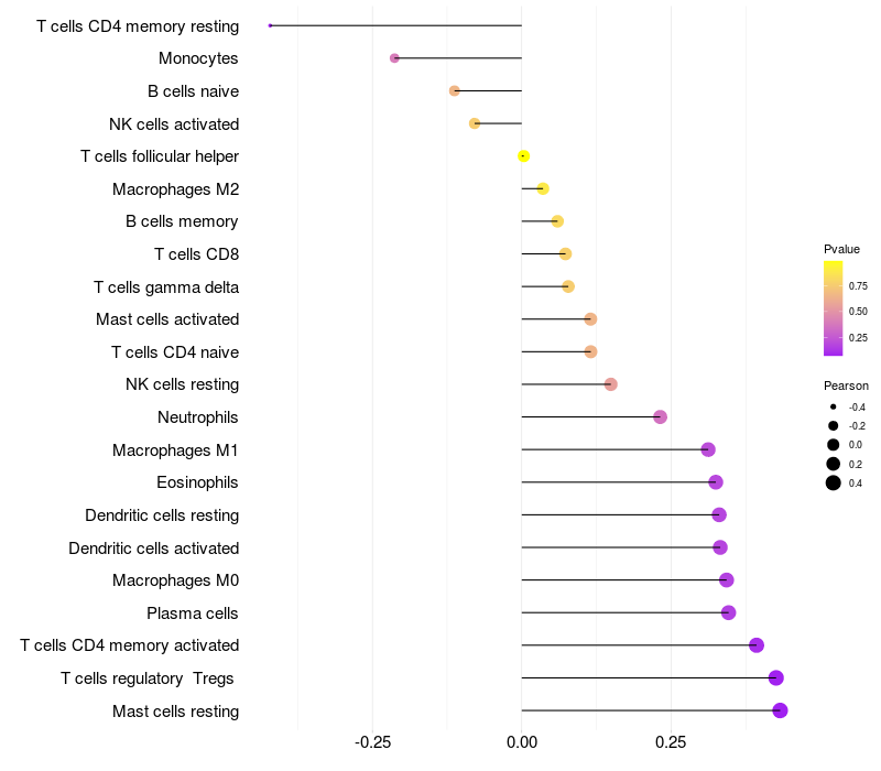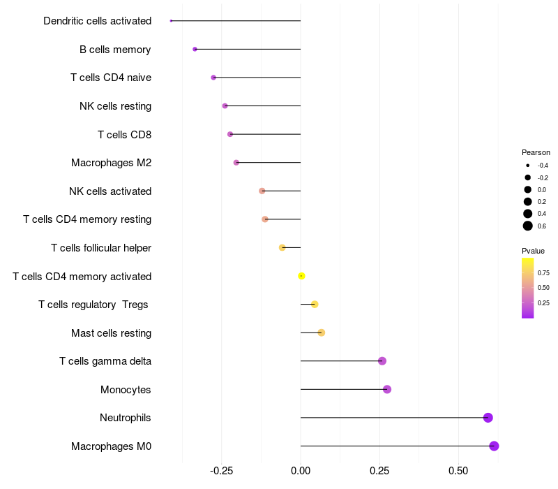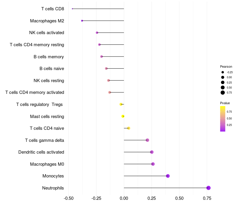 Lollipop of MAPK3 expression and immune infiltrating cell level correlation result in HTLV1+ samples