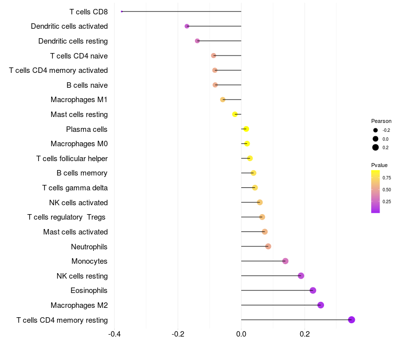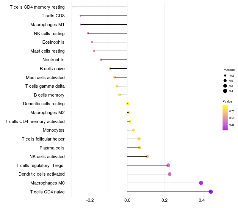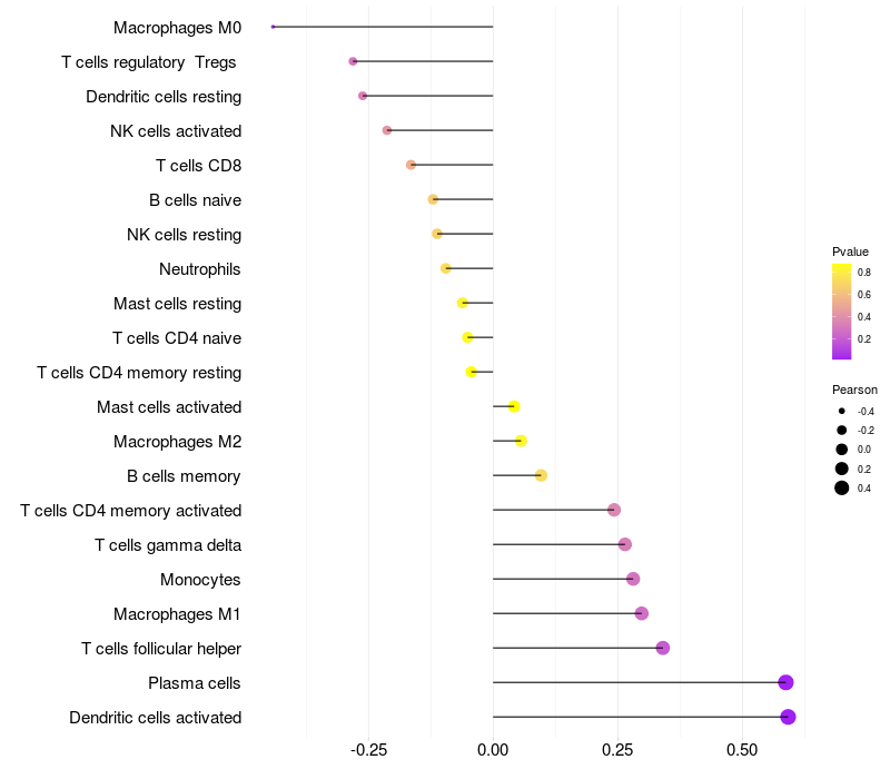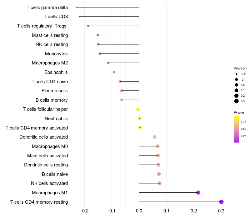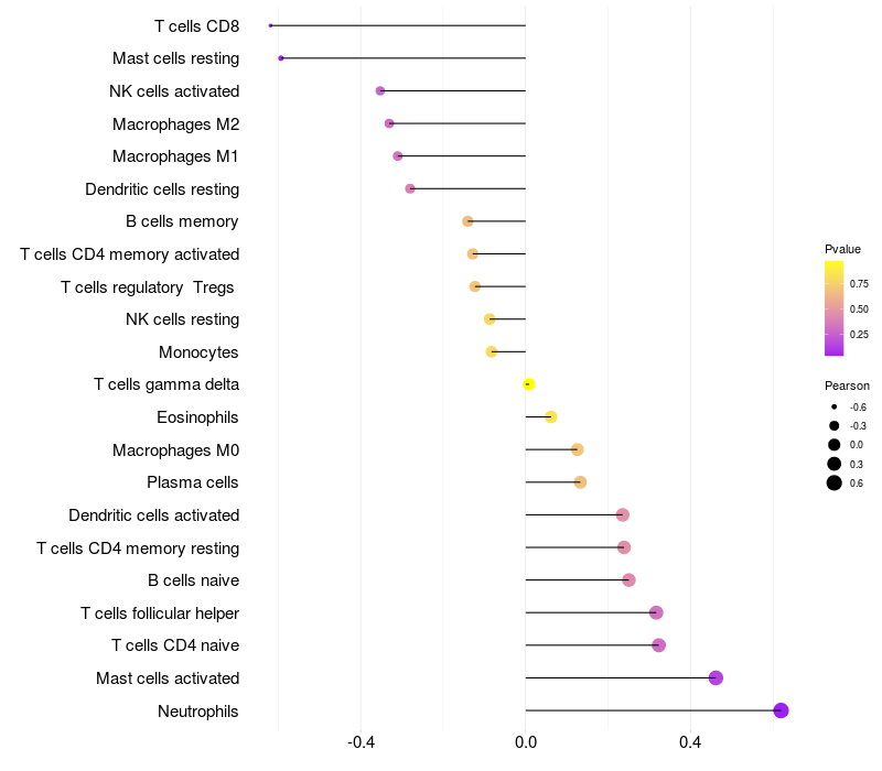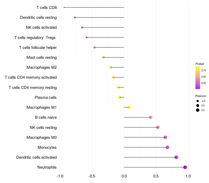 Lollipop of MAPKAPK5 expression and immune infiltrating cell level correlation result in HPV+ samples