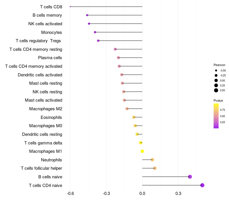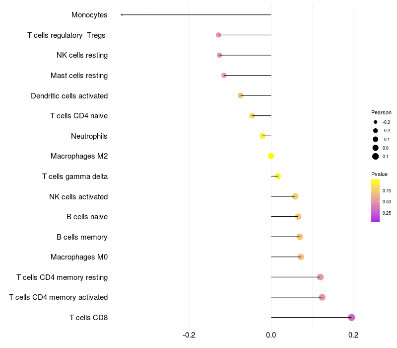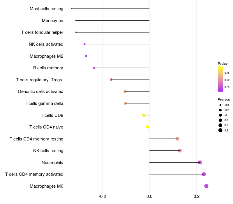 Lollipop of MAPT expression and immune infiltrating cell level correlation result in HTLV1+ samples