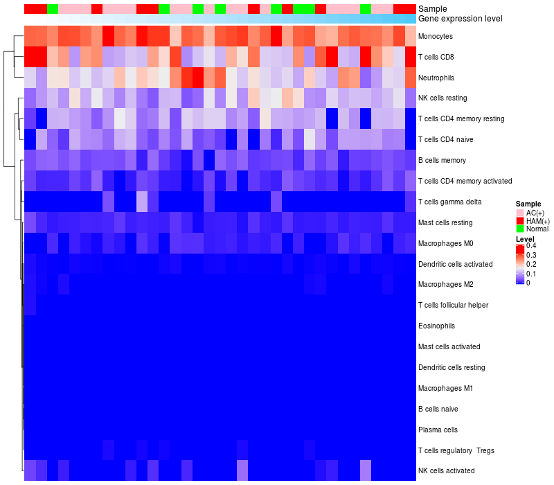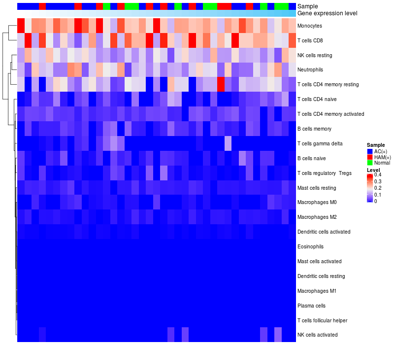 Normal (8), Asymptomatic carriers (HTLV1+)(17), HTLV-1-associated myelopathy (HTLV1+)(10) |