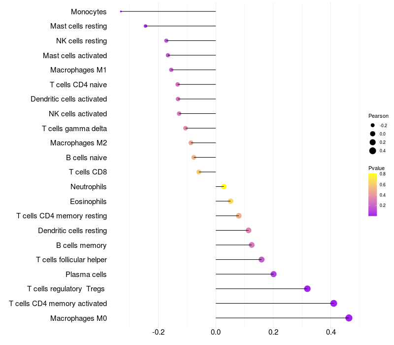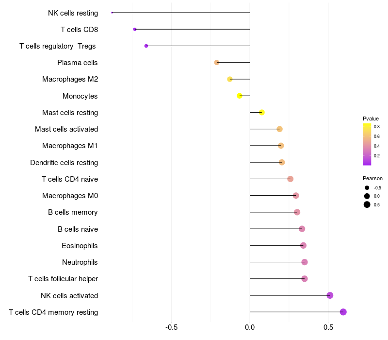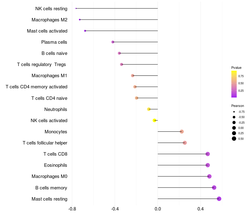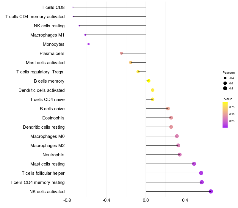 Lollipop of MARCKS expression and immune infiltrating cell level correlation result in HBV+ Liver cirrhosis samples