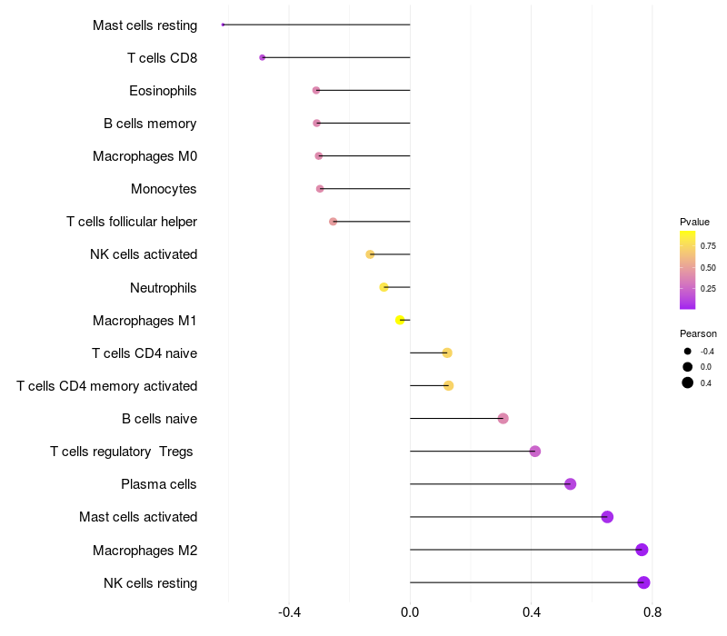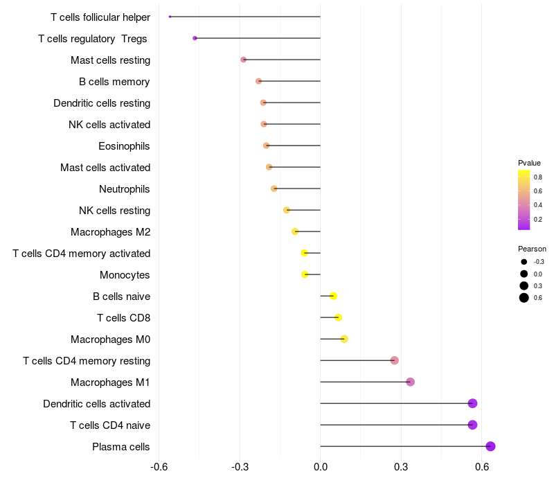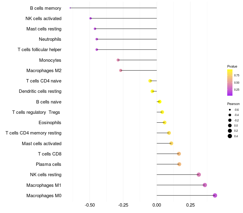 Lollipop of MASP1 expression and immune infiltrating cell level correlation result in HBV+ Liver cirrhosis samples