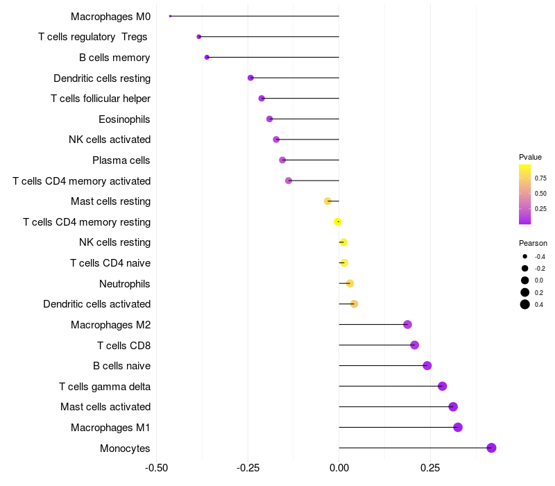 Lollipop of MASP1 expression and immune infiltrating cell level correlation result in HBV+ samples