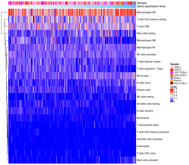 Liver hepatocellular carcinoma HCV (HBV+)(86), Liver hepatocellular carcinoma HCV (HBV-)(19), Liver hepatocellular carcinoma (HBV+)(209), Liver hepatocellular carcinoma (HBV+)(60), Paracancerous HCV (HBV+)(4), Paracancerous (HBV-)(28), Paracancerous (HBV+)(18) |