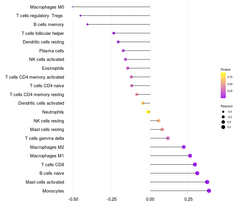 Lollipop of MAT1A expression and immune infiltrating cell level correlation result in HBV+ samples