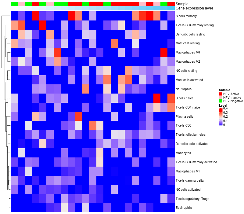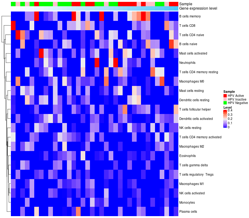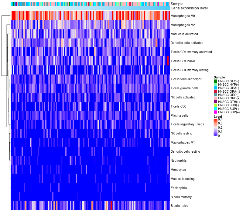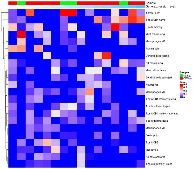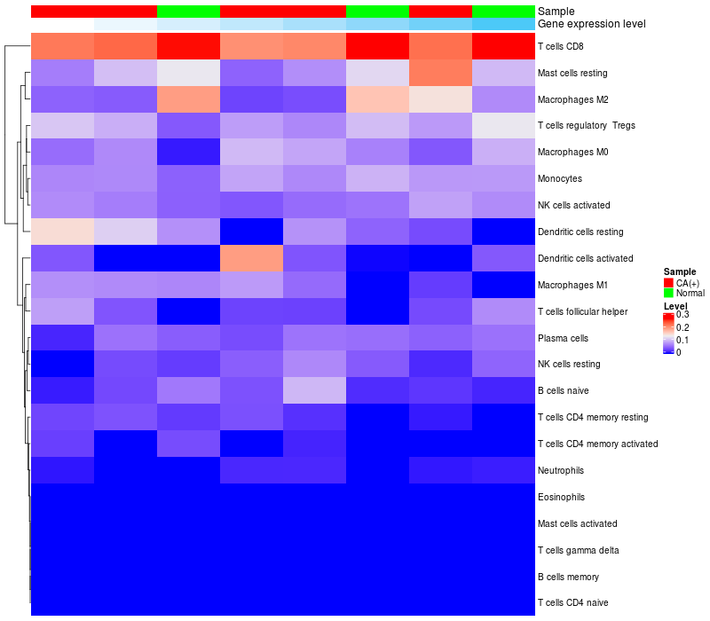 • Left: Heatmap of target gene expression and the level of various types of immune cells (cell type fractions) in all samples based on CIBERSORT method.