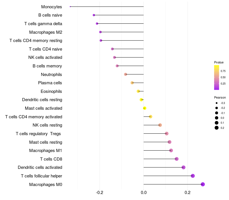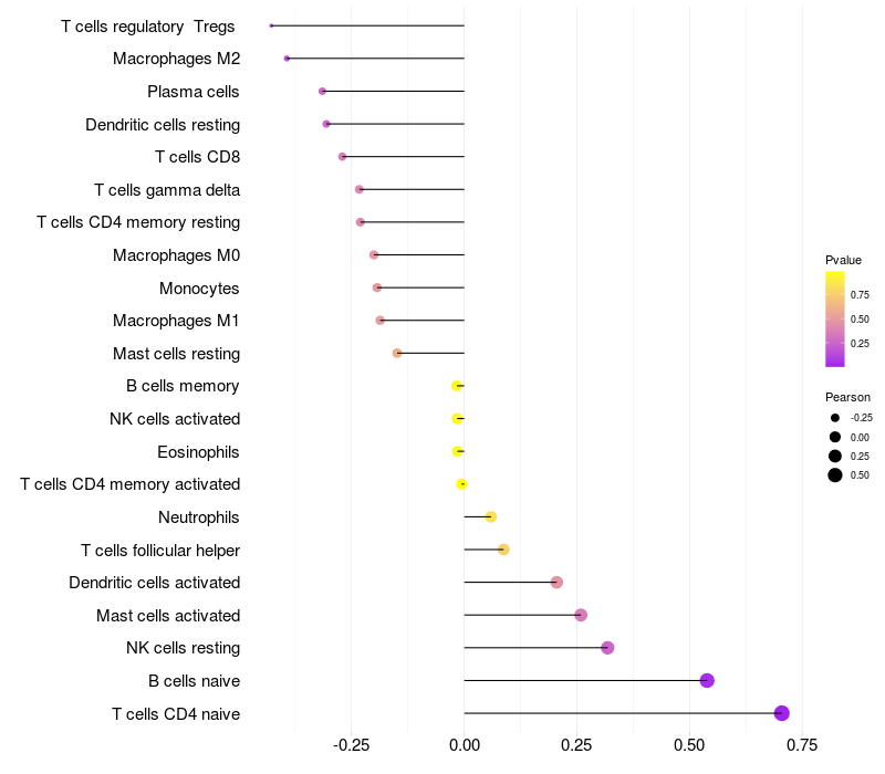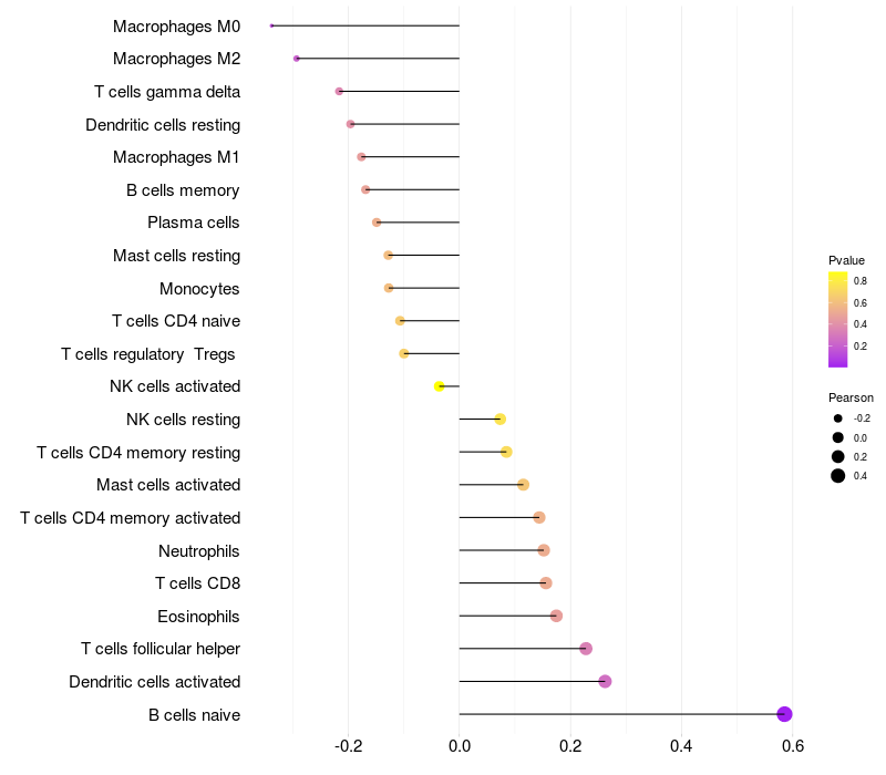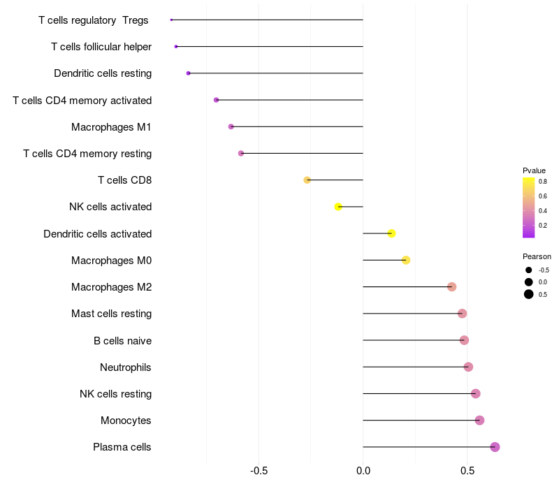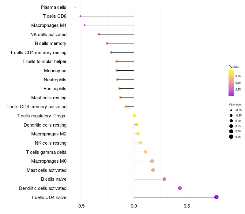 • Right: Correlation of target gene expression and the level of various types of immune cells in virus positive samples (Pearson Correlation Coefficient).