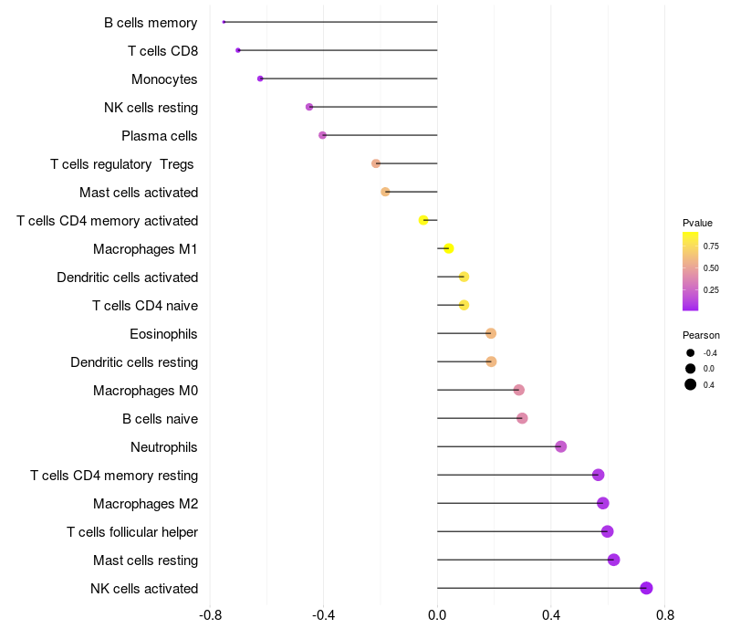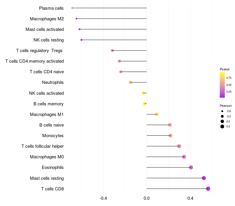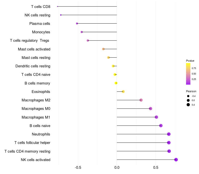 Lollipop of MAZ expression and immune infiltrating cell level correlation result in HBV+ samples