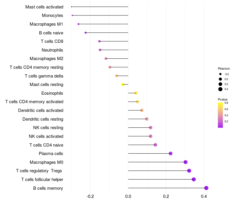 Lollipop of MAZ expression and immune infiltrating cell level correlation result in HBV+ Liver cirrhosis samples