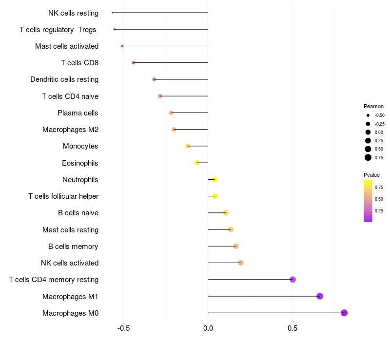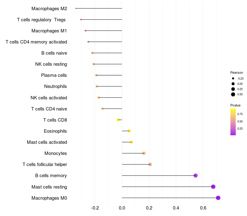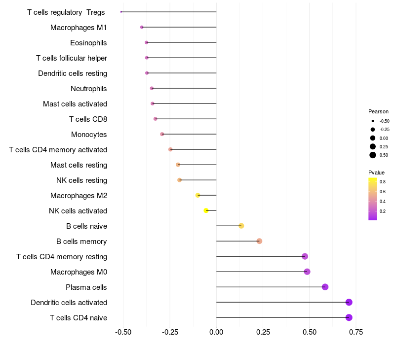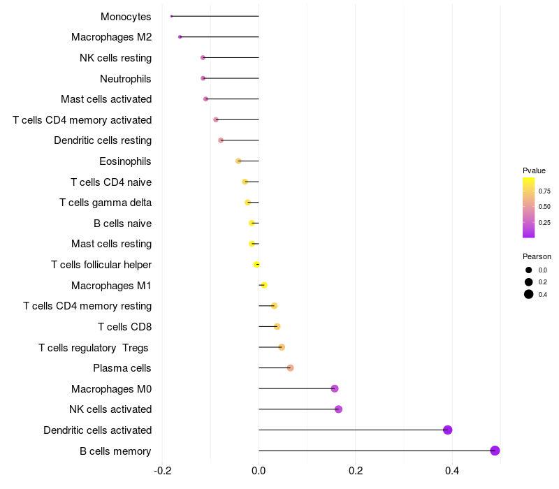Lollipop of MBD5 expression and immune infiltrating cell level correlation result in HBV+ Liver cirrhosis samples