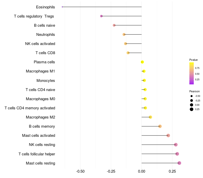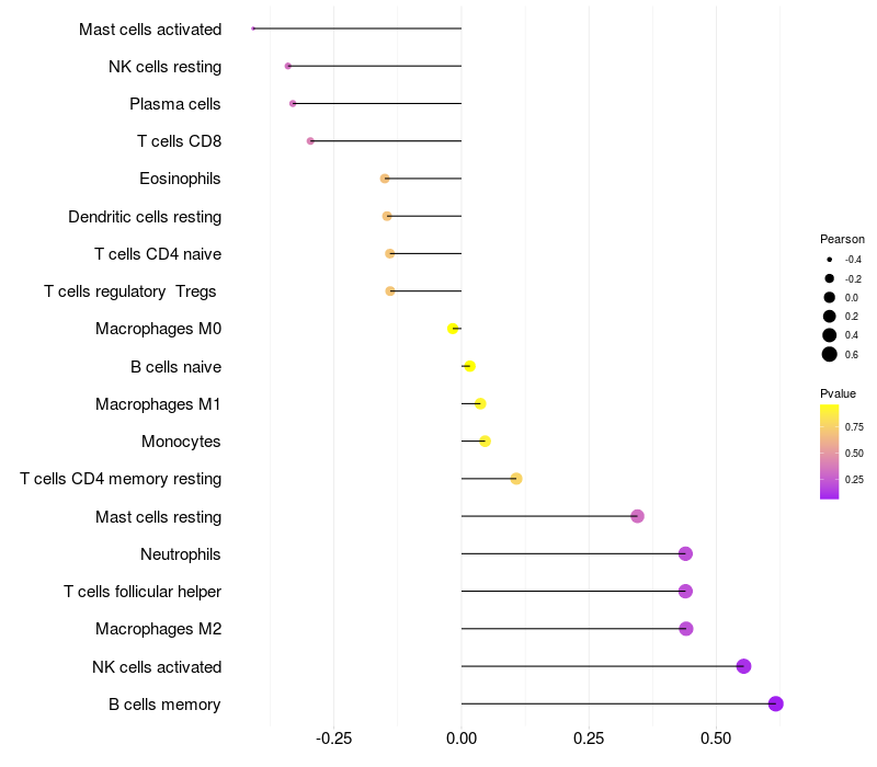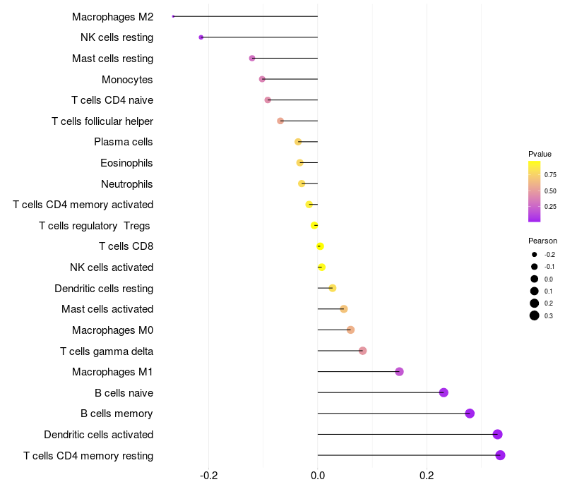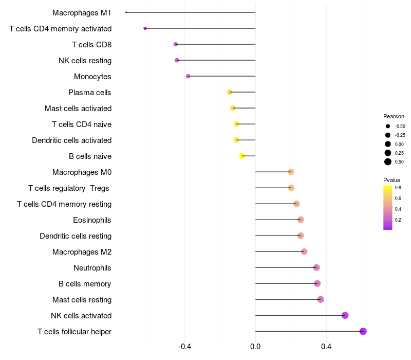 Lollipop of MBNL1 expression and immune infiltrating cell level correlation result in HBV+ Liver cirrhosis samples