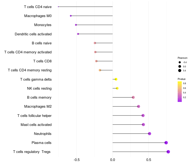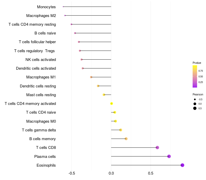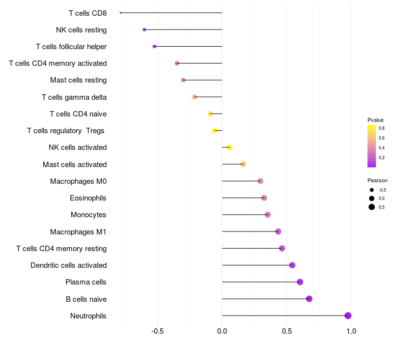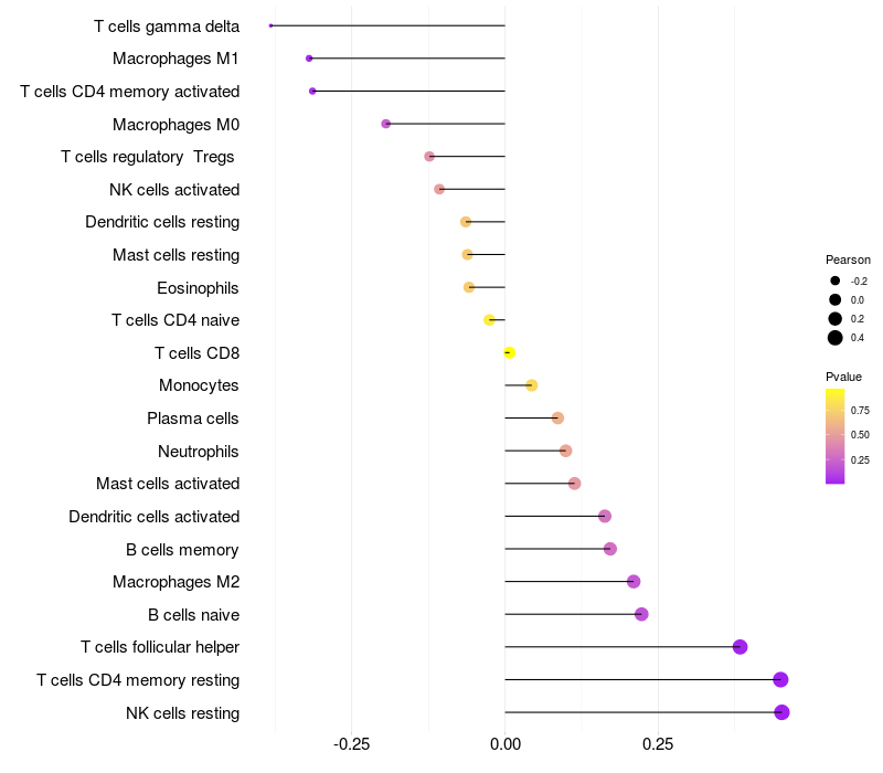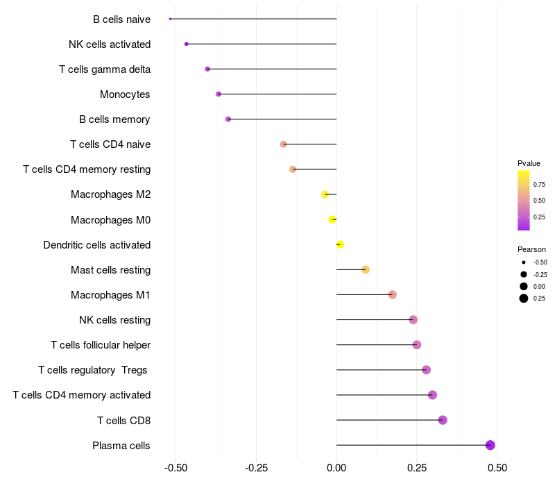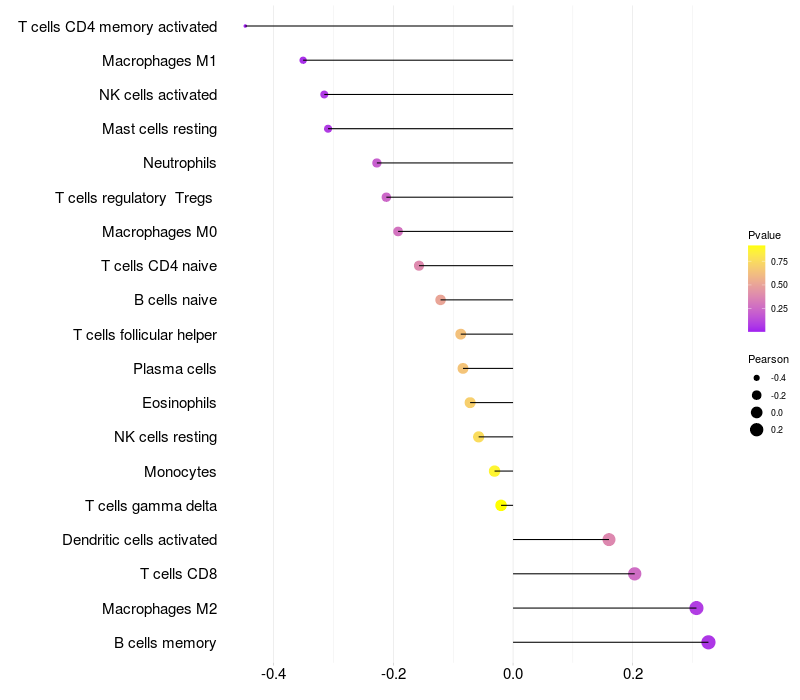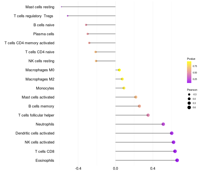 Lollipop of MBOAT2 expression and immune infiltrating cell level correlation result in EBV+ samples