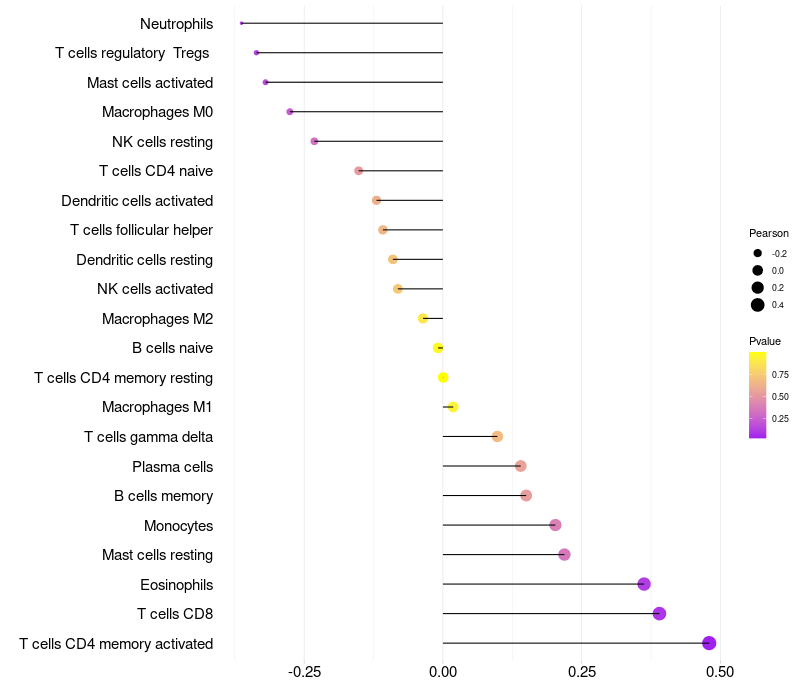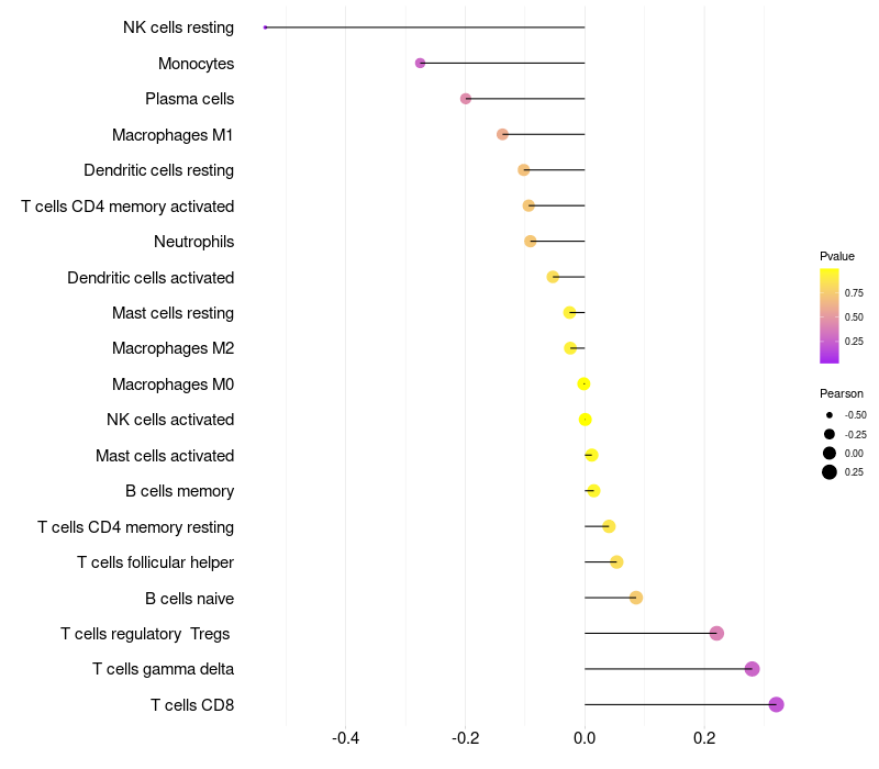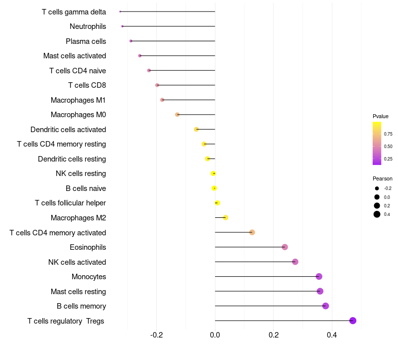 Lollipop of MC3R expression and immune infiltrating cell level correlation result in HPV+ samples