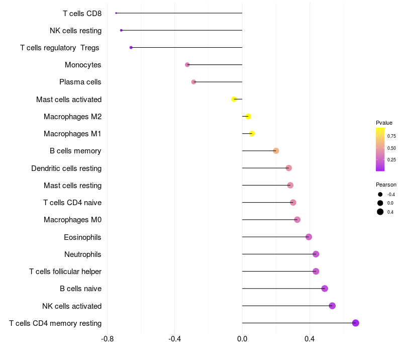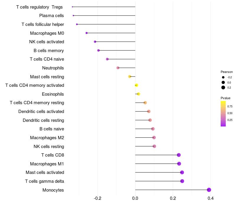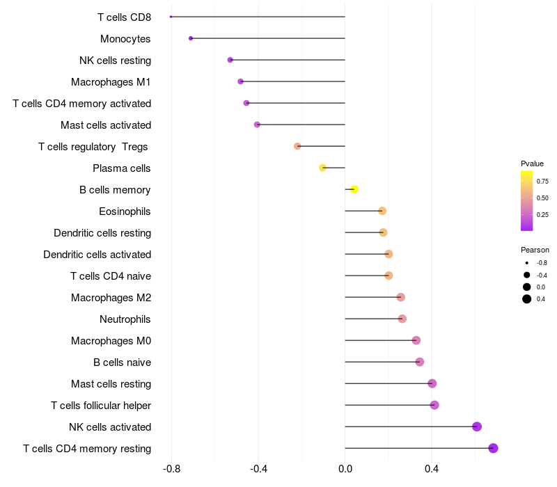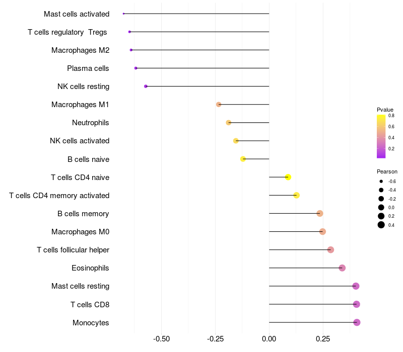 Lollipop of MCCC1 expression and immune infiltrating cell level correlation result in HBV+ Liver cirrhosis samples