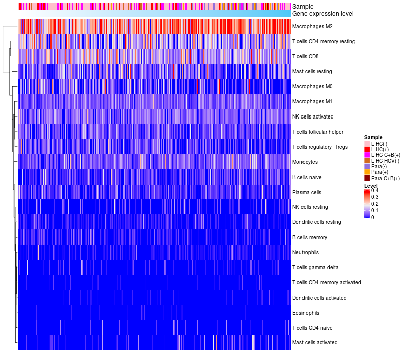 Liver hepatocellular carcinoma HCV (HBV+)(86), Liver hepatocellular carcinoma HCV (HBV-)(19), Liver hepatocellular carcinoma (HBV+)(209), Liver hepatocellular carcinoma (HBV+)(60), Paracancerous HCV (HBV+)(4), Paracancerous (HBV-)(28), Paracancerous (HBV+)(18) |