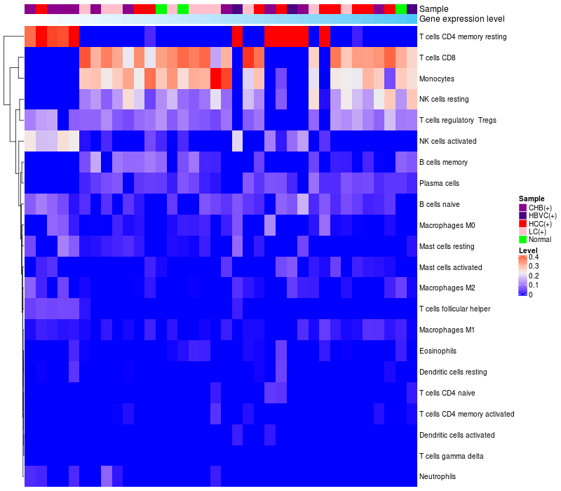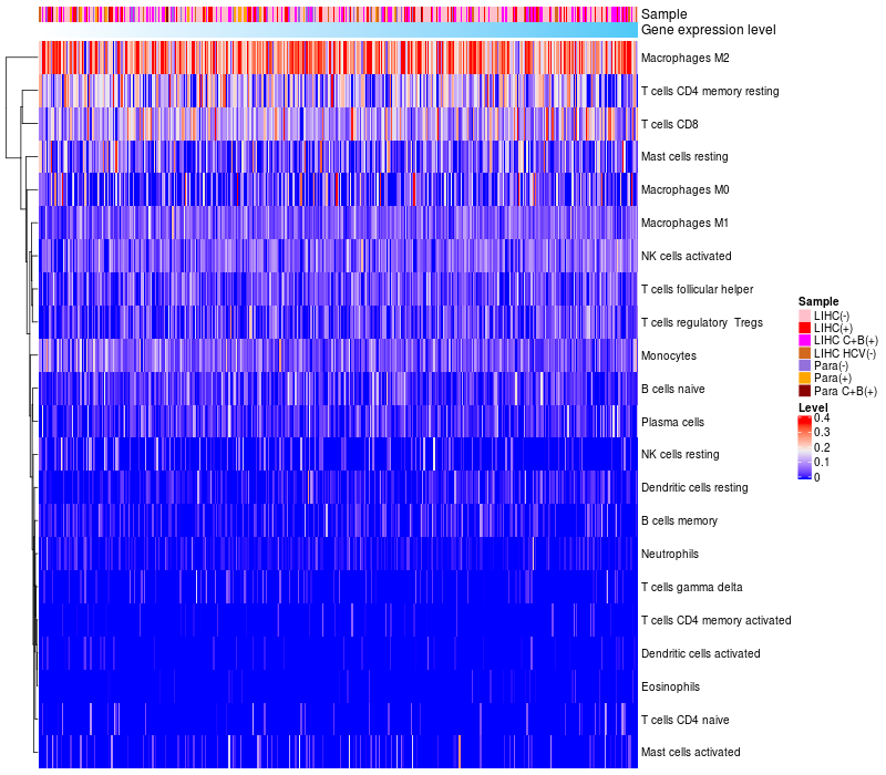 Liver hepatocellular carcinoma HCV (HBV+)(86), Liver hepatocellular carcinoma HCV (HBV-)(19), Liver hepatocellular carcinoma (HBV+)(209), Liver hepatocellular carcinoma (HBV+)(60), Paracancerous HCV (HBV+)(4), Paracancerous (HBV-)(28), Paracancerous (HBV+)(18) |