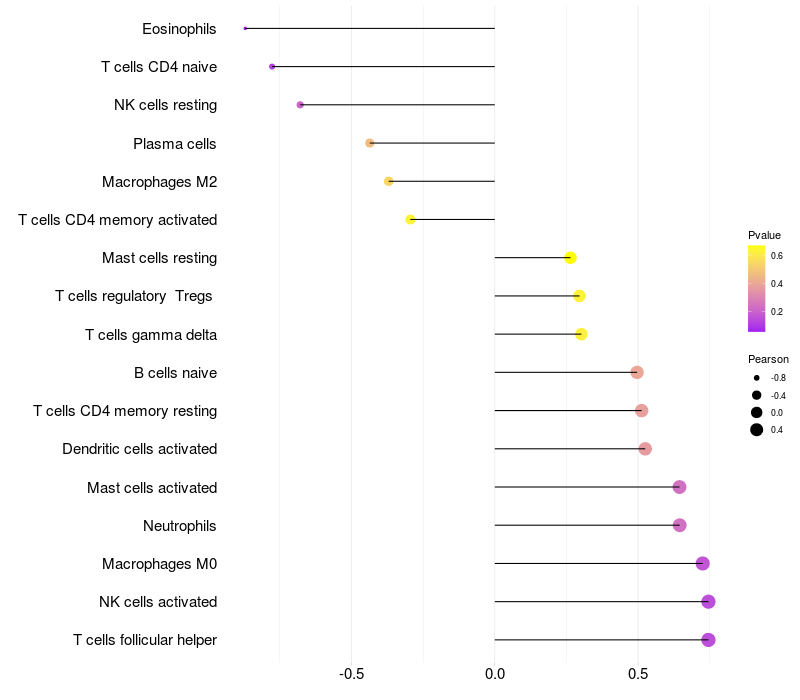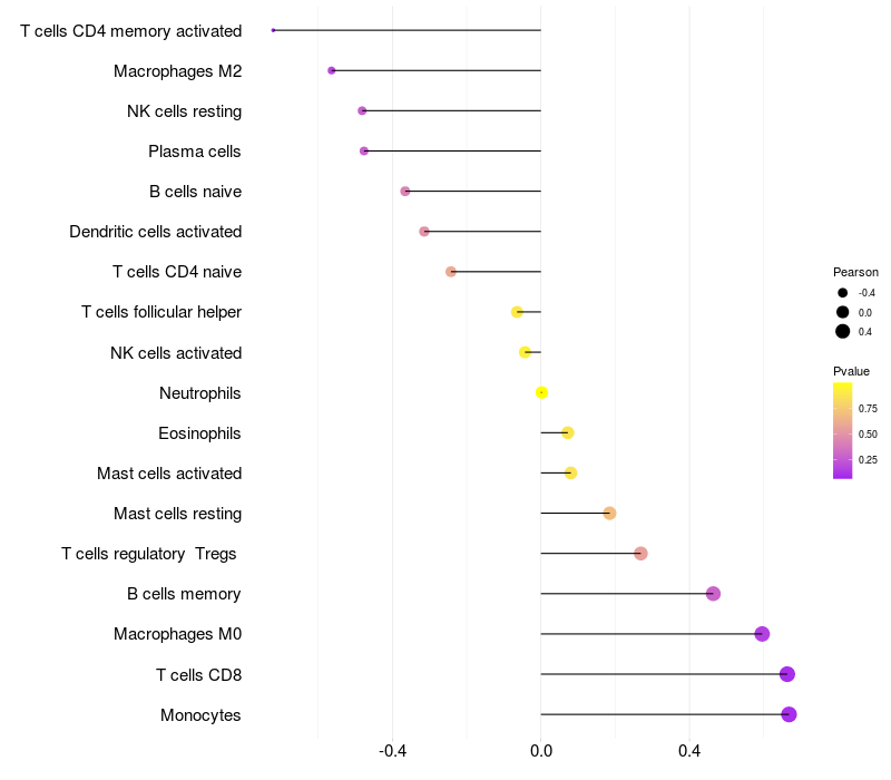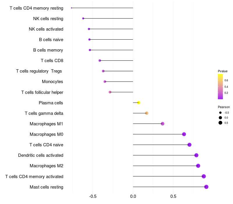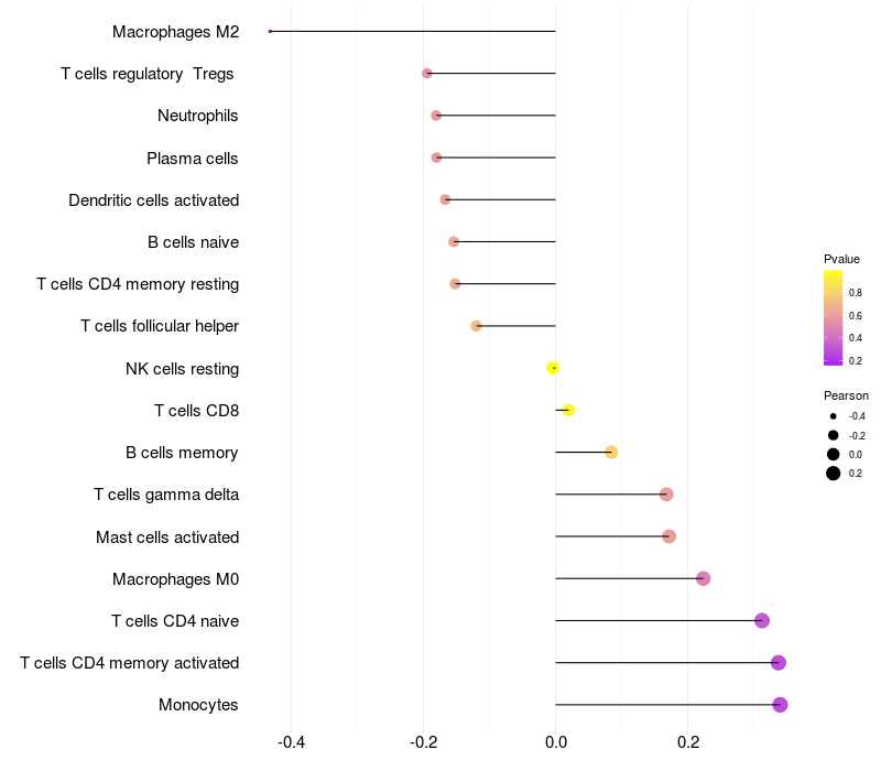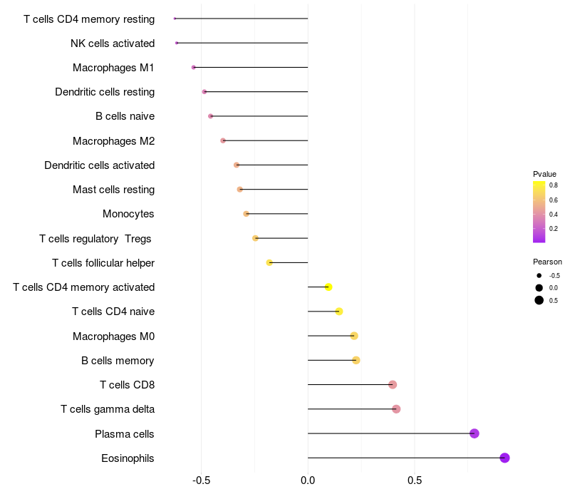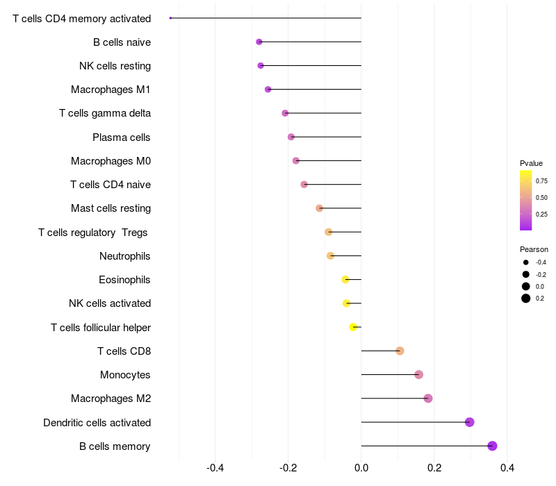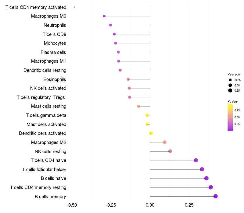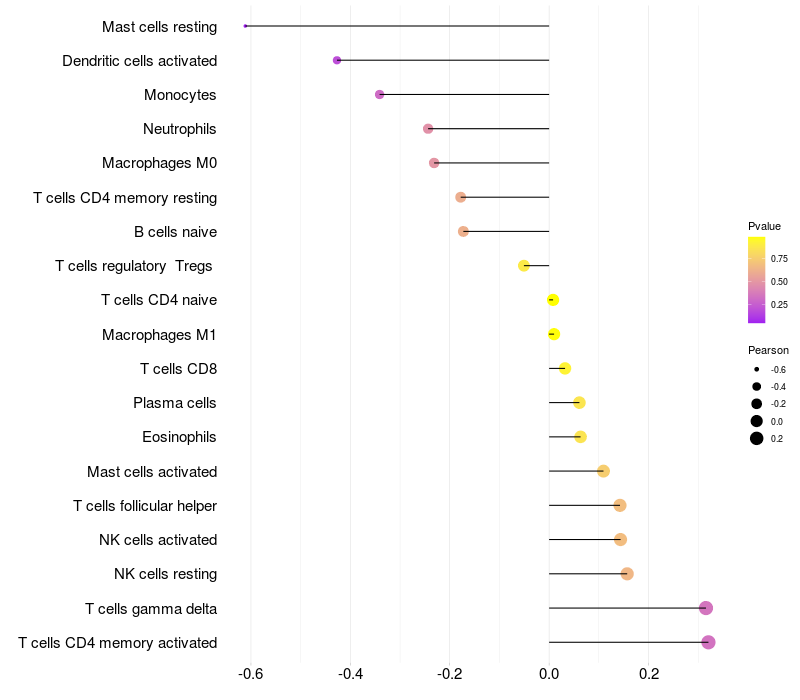 Lollipop of ME3 expression and immune infiltrating cell level correlation result in EBV+ samples
