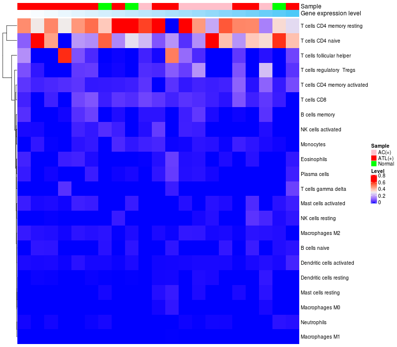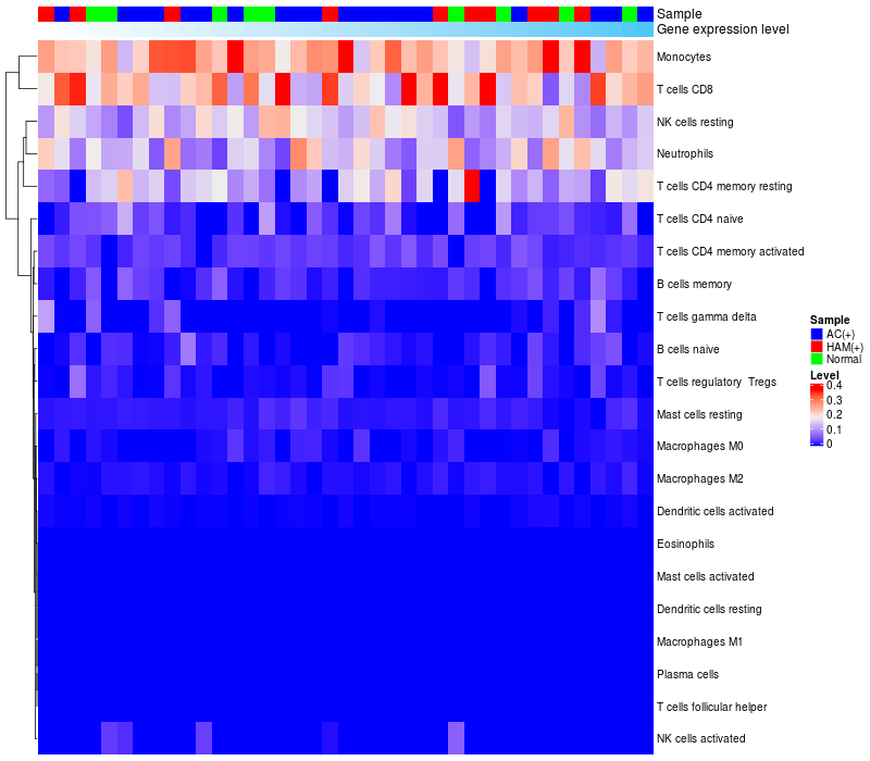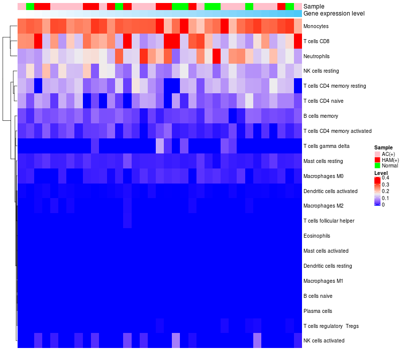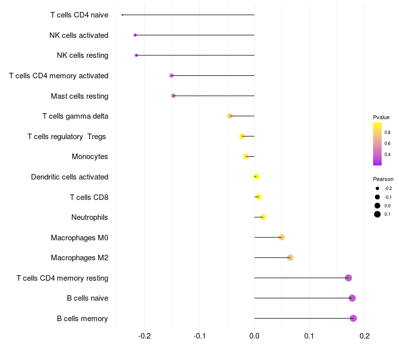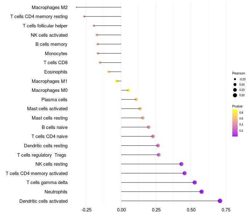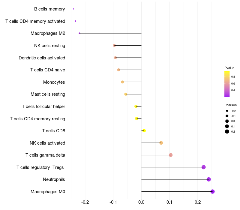Lollipop of MED18 expression and immune infiltrating cell level correlation result in HTLV1+ samples