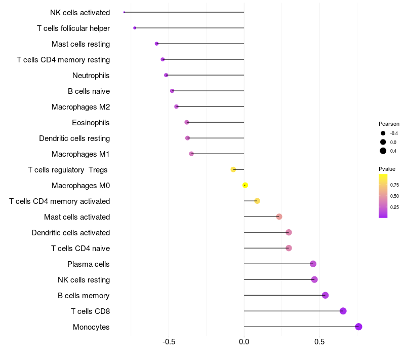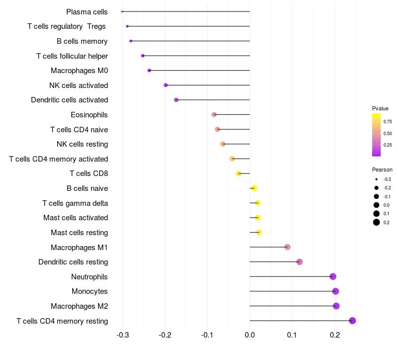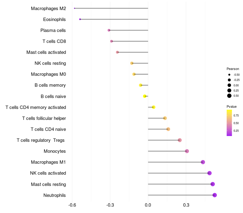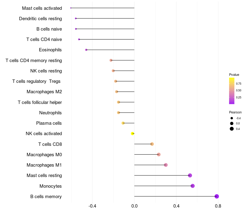 Lollipop of MEGF9 expression and immune infiltrating cell level correlation result in HBV+ Liver cirrhosis samples