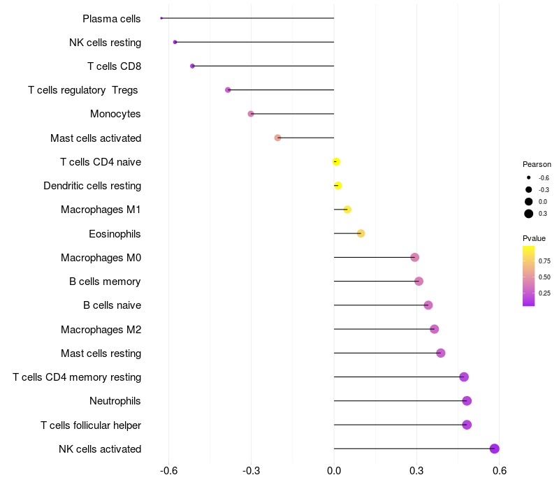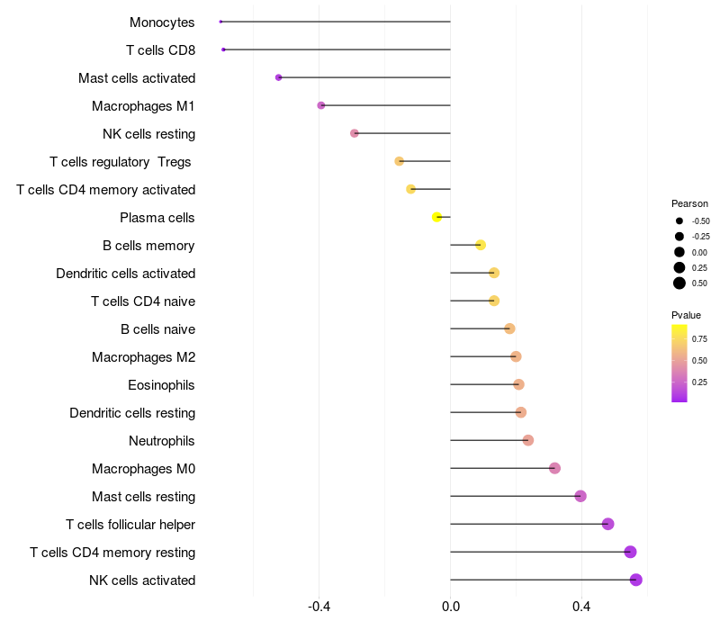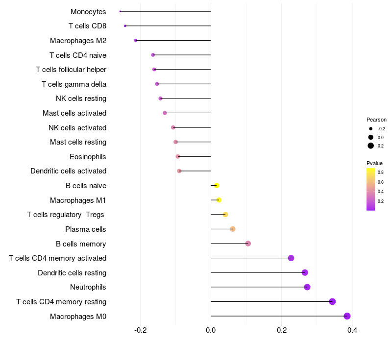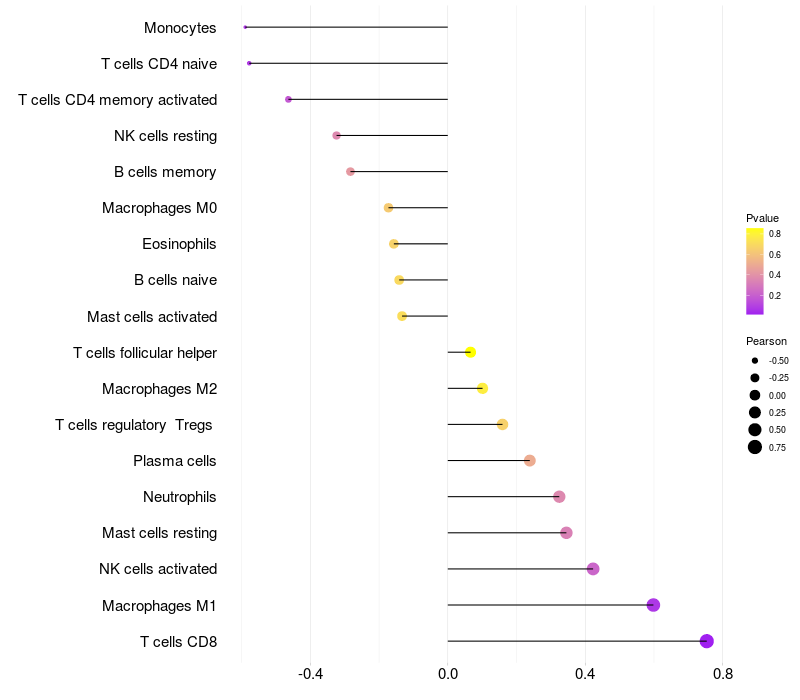 Lollipop of METTL4 expression and immune infiltrating cell level correlation result in HBV+ Liver cirrhosis samples