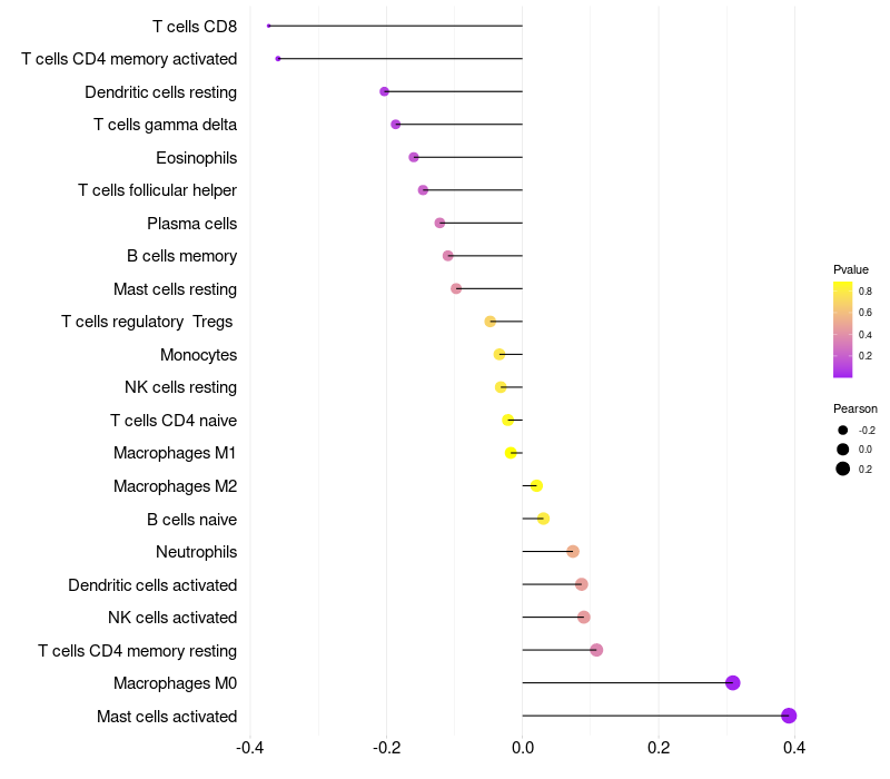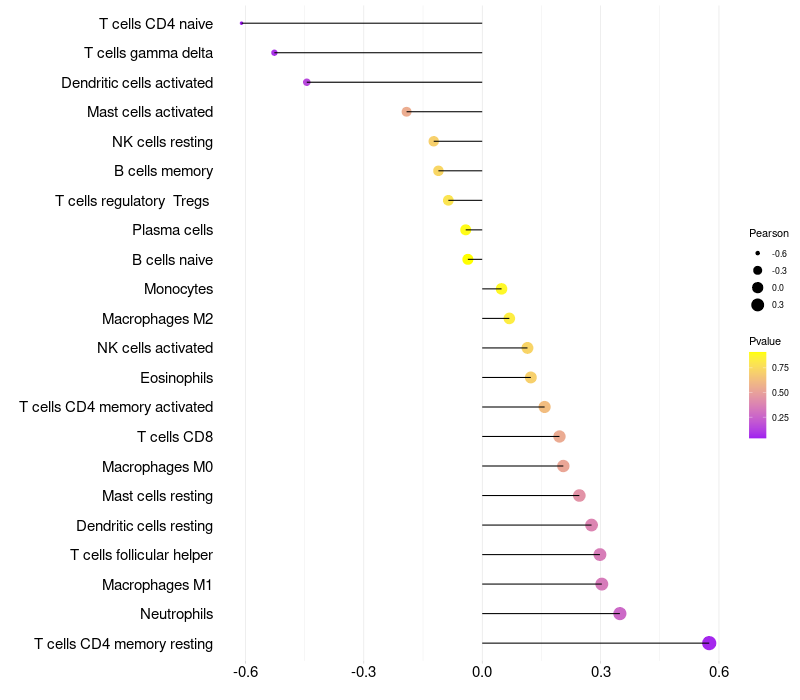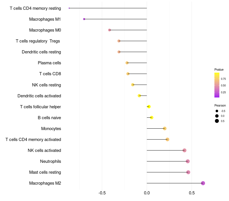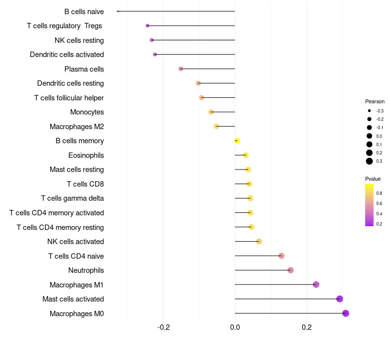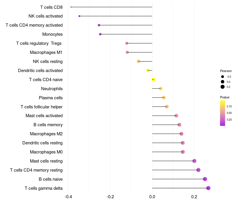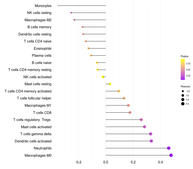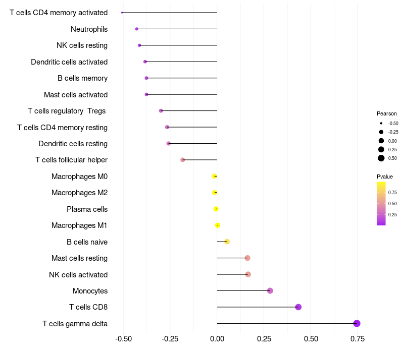 Lollipop of MEX3B expression and immune infiltrating cell level correlation result in HPV+ samples