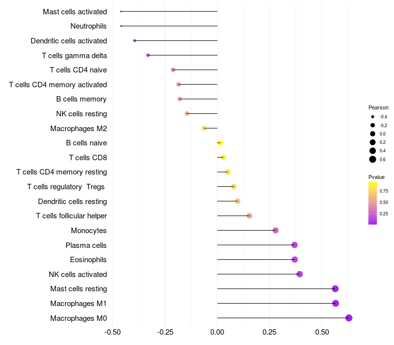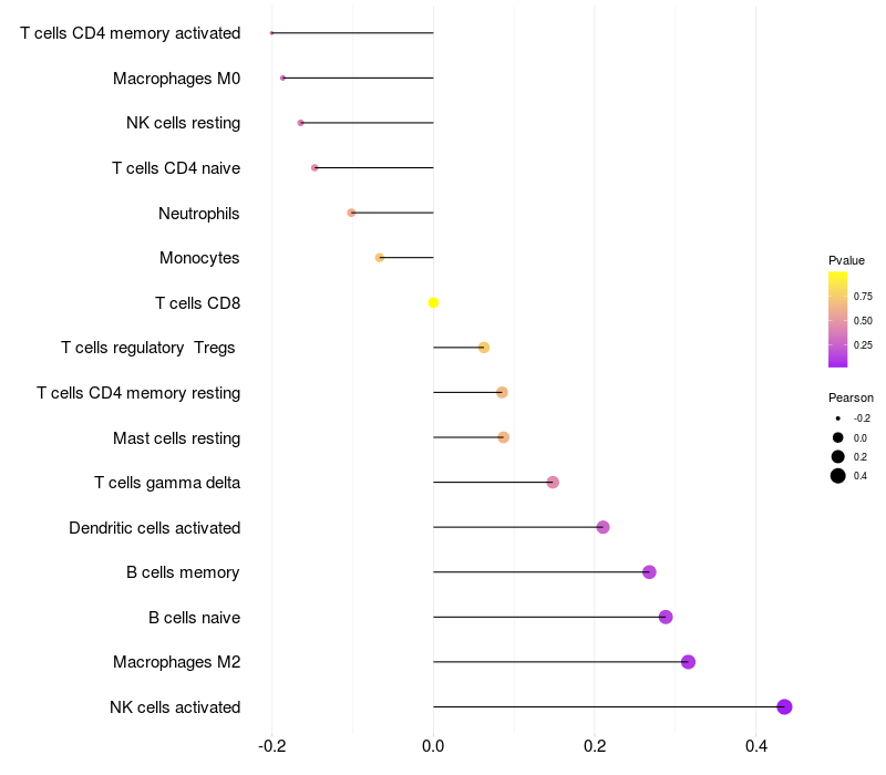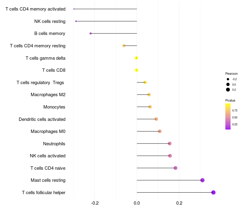 Lollipop of MFAP2 expression and immune infiltrating cell level correlation result in HTLV1+ samples