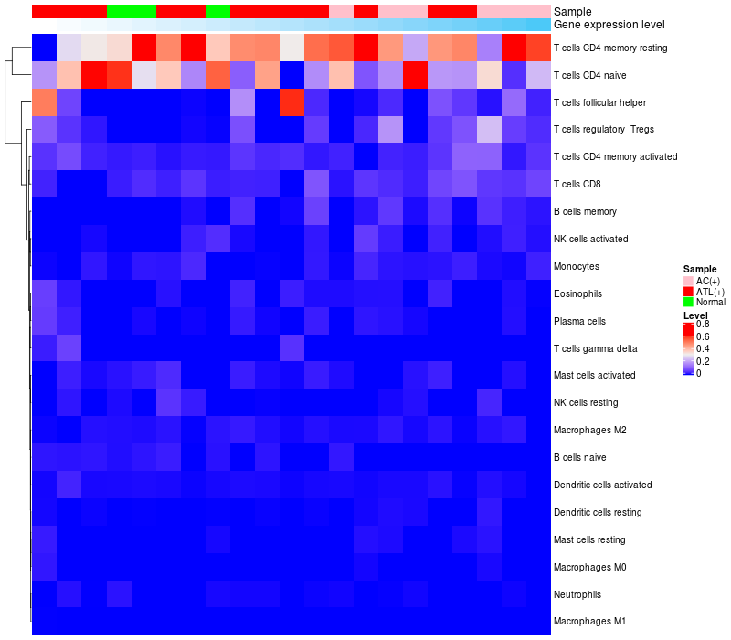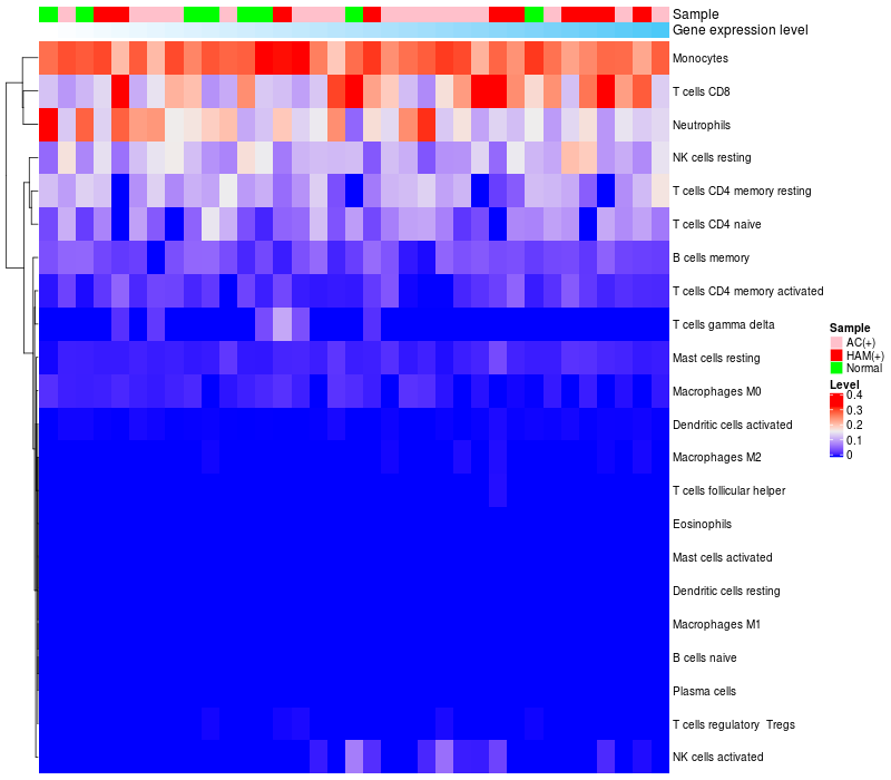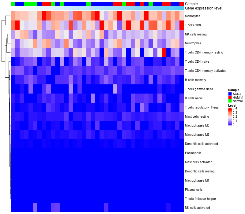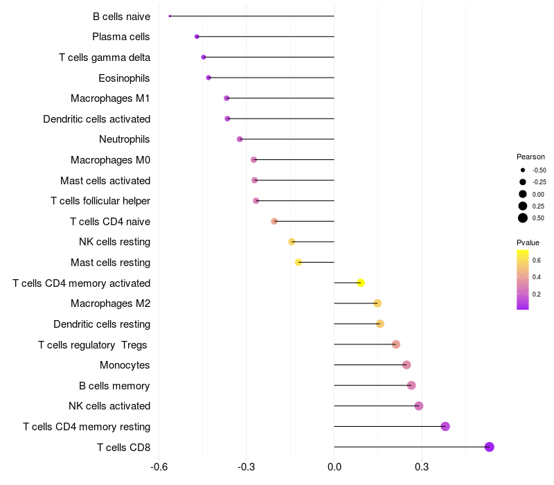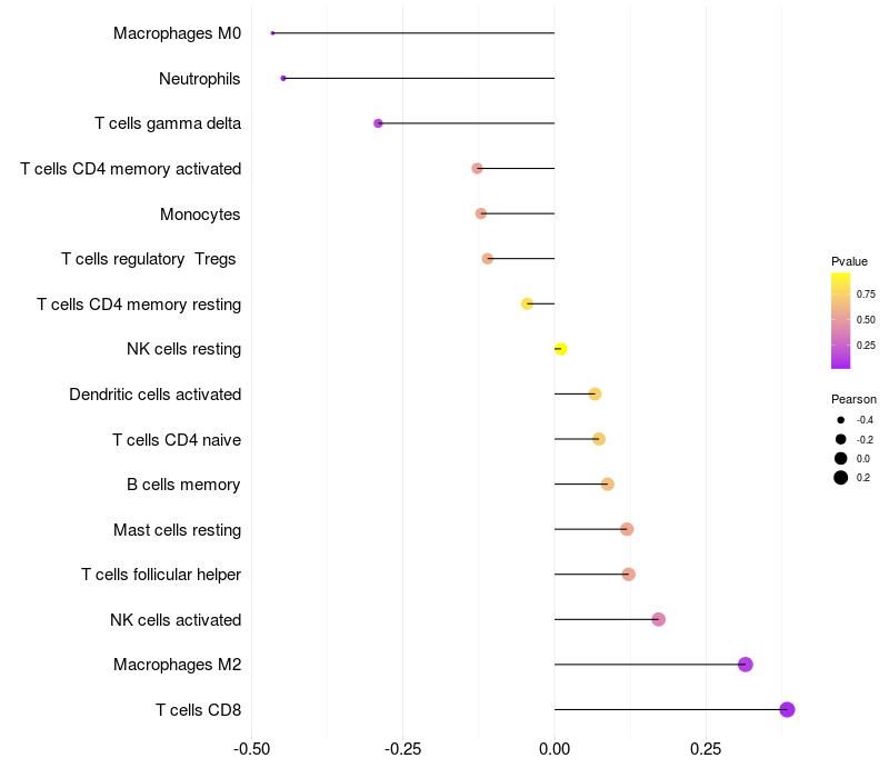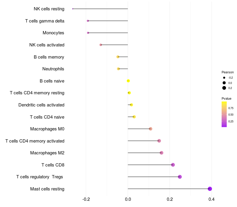 Lollipop of MFHAS1 expression and immune infiltrating cell level correlation result in HTLV1+ samples